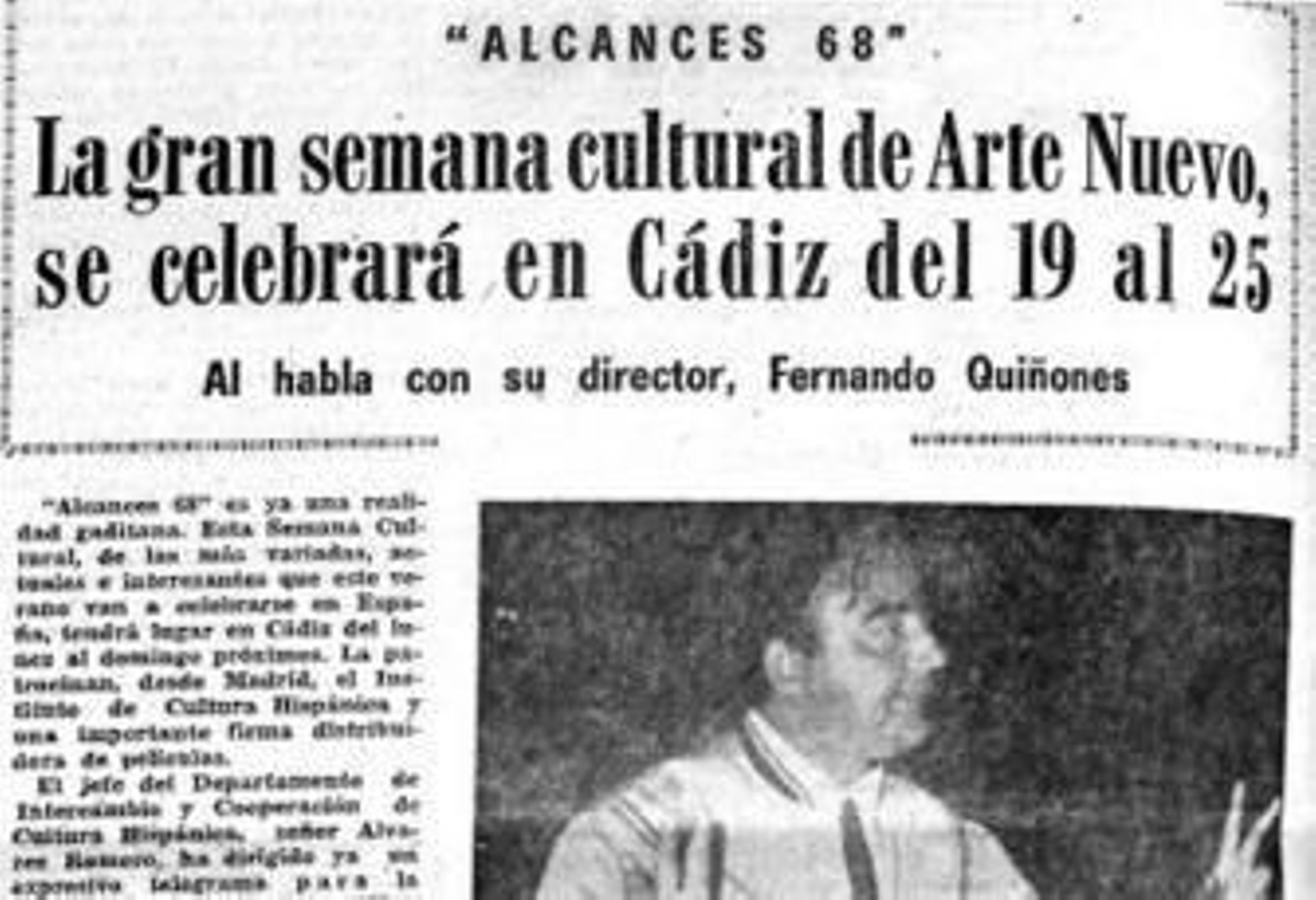 En el verano de 1968, Fernando Quiñones viajó desde Milán a Cádiz cargado de ilusiones y "de mi colección casera de pinturas, esculturas, y tres películas", señaló el escritor. Con este material y 6.000 pesetas, Quiñones pretendía despertar la aburrida cultura gaditana. Ese año nació Alcances.