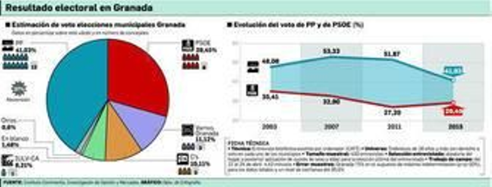 LA progresión de los sucesivos resultados que ha cosechado José Torres Hurtado (PP) desde que optó a la Alcaldía de Granada por primera vez en 2003, podrían sufrir un descenso notable. Los 'populares' pierden cuatro concejales en relación a los comicios de hace cuatro años, o lo que es lo mismo, se esfuma la mayoría absoluta al pasar de 16 a 12 ediles. Una caída de 10,84 puntos al pasar del 51,87% de 2011 al 41,03%, el nivel de respaldo más bajo en todo el periplo electoral del actual regidor. Son los resultados que ofrece el sondeo de Commentia realizado para Granada Hoy. El posible desgaste motivado por la acción de gobierno durante tres legislaturas afrontadas desde el primer sillón de la plaza del Carmen sumado a la irrupción de fuerzas emergentes es a primera vista el síntoma más probable del descenso en el número de apoyos.