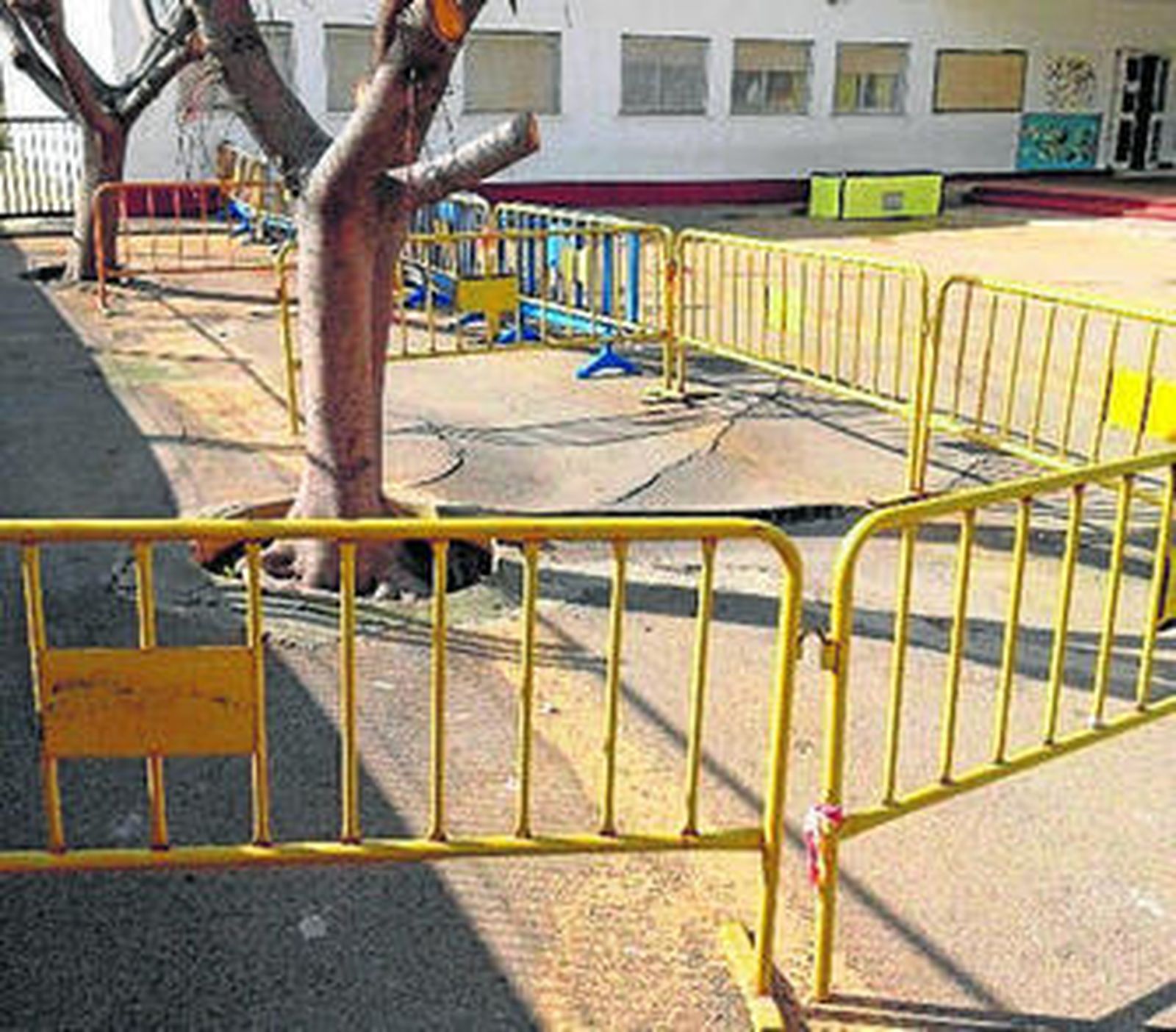 Parte del patio del colegio Profesor Tierno Galván lleva semanas vallado con motivo del mal estado de su pavimento. Las raíces de los árboles plantados en este espacio de recreo y juego han levantado el asfalto hasta unos 12 centímetros, lo que supone un peligro para los menores. Cabe recordar que en el año 2011 un alumno de tres años resultó herido al caerse en el patio y, como consecuencia del incidente, le tuvieron que coger cinco puntos de sutura. "Llevamos años pidiendo que se arregle este pavimento", recuerda un miembro de la Asociación de Madres y Padres de Alumnos del colegio.