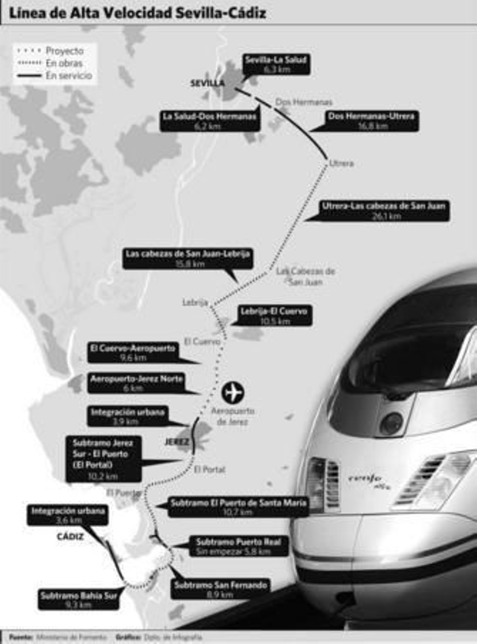 En la actualidad, la línea de alta velocidad Sevilla-Cádiz, de 152 kilómetros de longitud, se encuentra en marcha en su totalidad, con una inversión que supera los 700 millones de euros. De esos 152 kilómetros, 64,4 se encuentran en servicio, 72 en construcción y 15,6 en proyecto, tal como puede verse en la infografía que ilustra esta información.