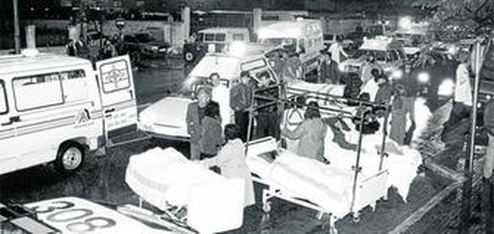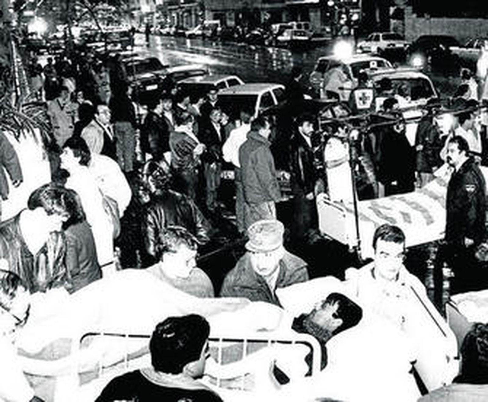 La madrugada del 17 de abril de 1991 se dieron algunas imágenes que forman parte ya de la historia de la ciudad. Camas con enfermos en plena avenida de la ciudad, enfermeras sosteniendo goteros, pacientes en pijamas viajando en taxis, en autobuses, el ejército desplegado para trasladar material y enfermos. Como ven en las fotografías de nuestro compañero Manuel Bernet, los ciudadanos se volcaron ayudando en la evacuación de un centro en el que había ingresado aquella noche 711 personas, de las que 276 recibieron el alta. A la derecha, también puede verse cómo el pañol del sótano del hospital quedó totalmente devastado por el fuego, durante el cual nació una niña a la que se llamó Candela.
