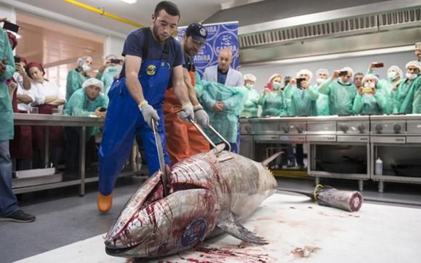 El ronqueo ha sido explicado por José Manuel León, de la firma Gadira, y dos profesionales de dicha empresa han diseccionado el atún. Cola, cabeza, parpatanas, lomos, morcillo, mormo, contramormo, facela, galete, descargamento, ventresca, tarantero, además del corazón o las huevas se han ido extrayendo de manera minuciosa. Y se ha ahondado en las propiedades culinarias de cada porción anatómica según su textura, grasa o presencia gelatinosa.