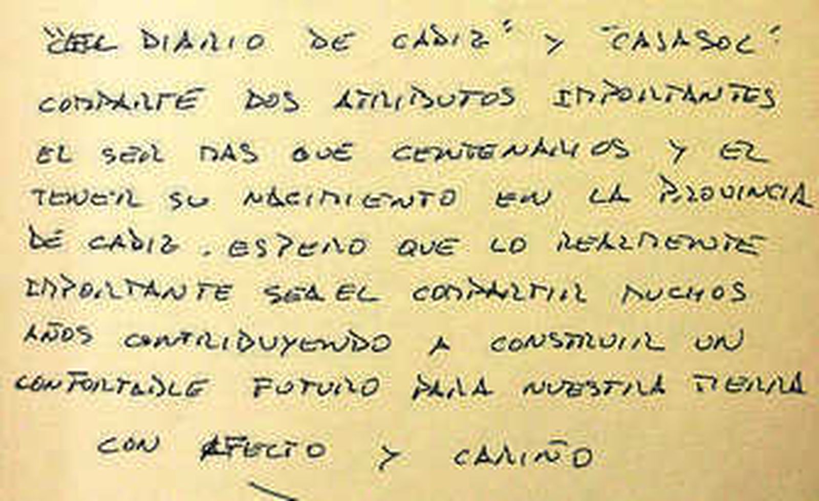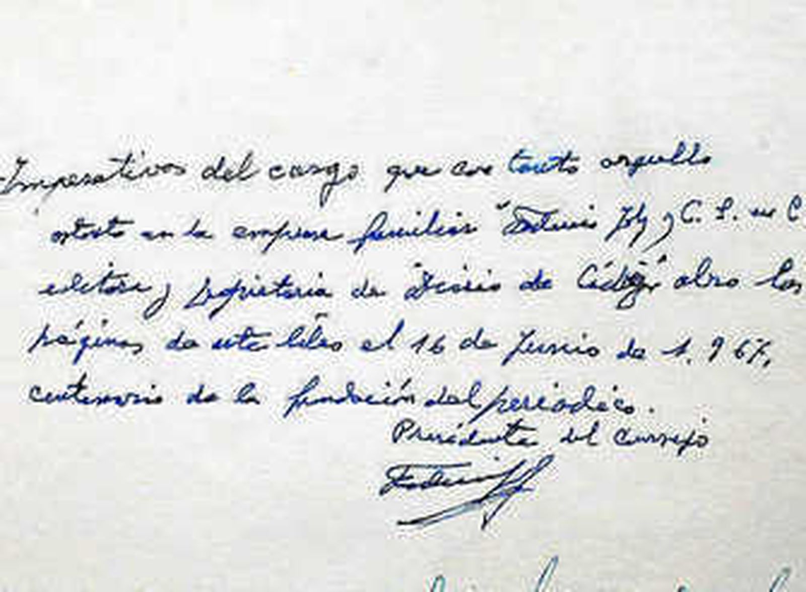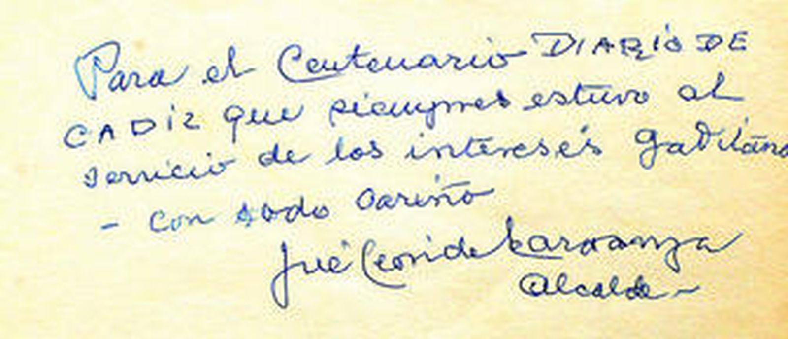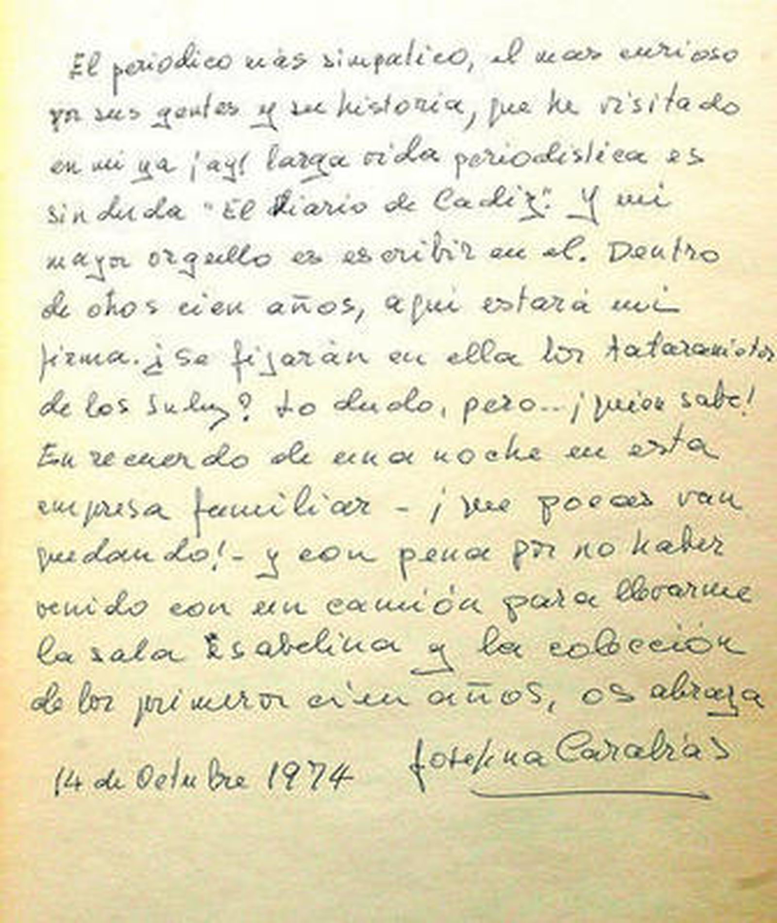 No mucho más tarde, aunque sin fecha, era el alcalde gobernante en la época, José León de Carranza el que firmaba "con todo cariño" en el libro. Y la Historia reciente seguía fluyendo en estas páginas de papel grueso y encuadernadas por los prestigiosos hermanos Galván. El 15 de septiembre de 1970, el gran patriarca de las Letras españolas durante el franquismo, José María Pemán, otorgaba un simbólico "Oscar de la prensa diaria" al Diario, y le otorgaba un mérito inaudito: "Ha conseguido que el marido le diga a su mujer, al salir temprano para su oficina: -Guárdame el Diario que quiero leerlo despacio cuando vuelva esta tarde".