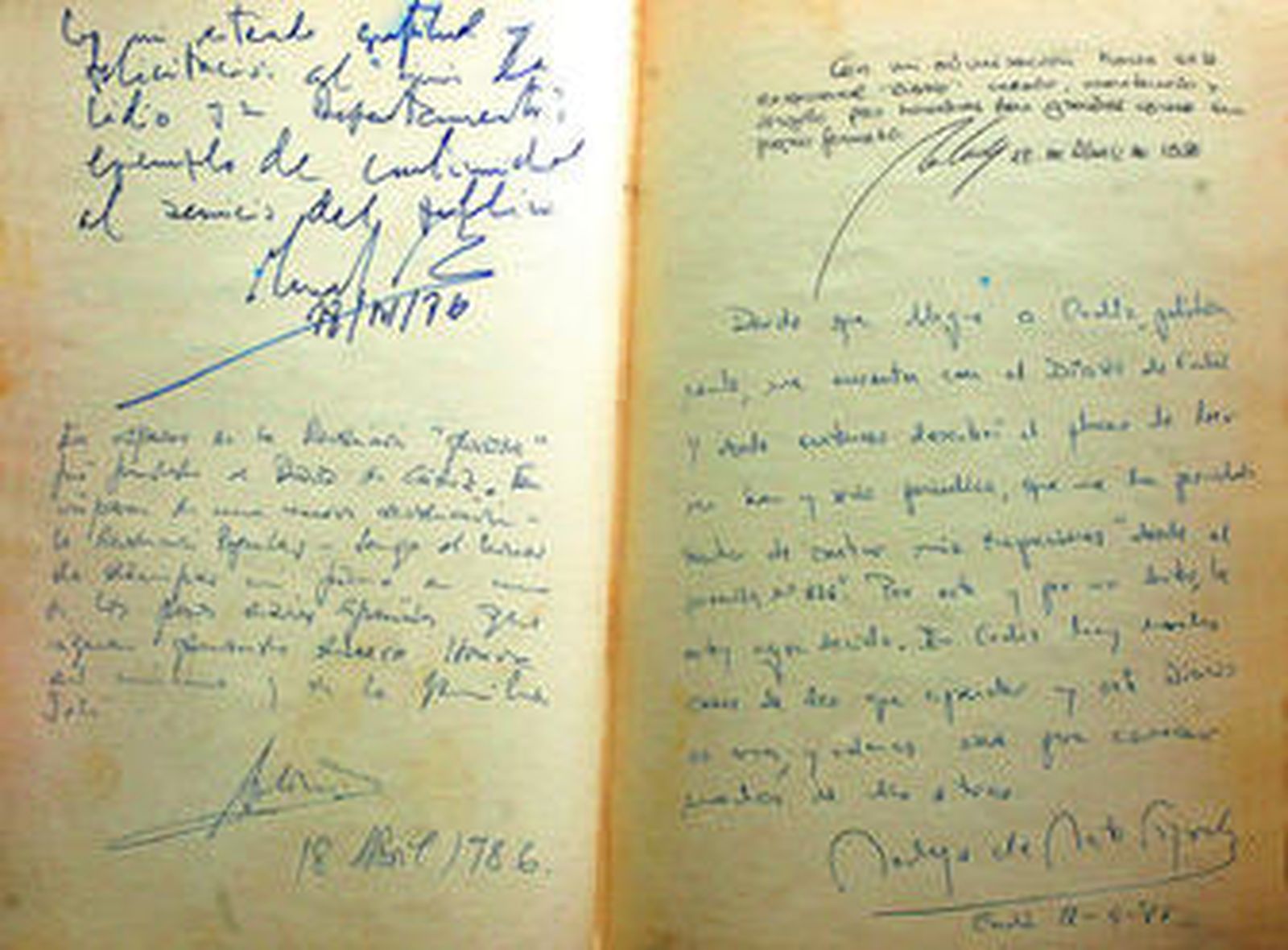 Una larga flor impar con cuatro pétalos, una paloma de la paz, un dibujo casi infantil del esquema de una rotativa o un guante de boxeo, decenas de firmas de personalidades, entre ellos dos premios Nobel de Literatura y firmas casi ilegibles que responden a diferentes formas de agradecimiento por parte de prelados, políticos, artistas, escritores, embajadores, financieros... Todos ellos, los que aparecen en las ilustraciones de estas páginas y muchos más, aceptaron en su día la invitación que se les hizo de visitar las instalaciones, las oficinas, la histórica hemeroteca o los despachos de Diario de Cádiz en su primitiva sede de la calle Ceballos o la actual, frente al muelle.