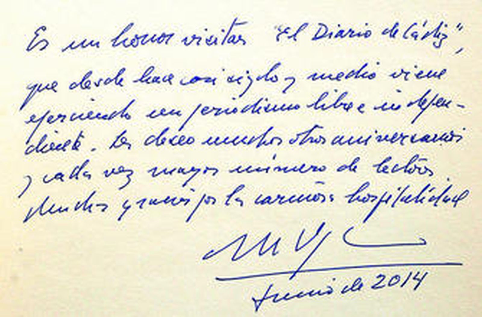 Inconfundible es la página que llenó Rafael Alberti con su paloma un mes de mayo de 1985, y especialmente emocionante es la larga flor con una sola palabra como raíz, "Gabriel", que regaló al periódico García Márquez en aquella recordada visita a la biblioteca de Federico Joly en 1997. Años más tarde, en este mismo 2014, otro premio Nobel latinoamericano, Mario Vargas Llosa estampaba su firma en las mismas páginas. Es la última, hasta ahora, de una larga serie amistosa, cariñosa, y reveladora, una historia escrita por sus propios protagonistas.