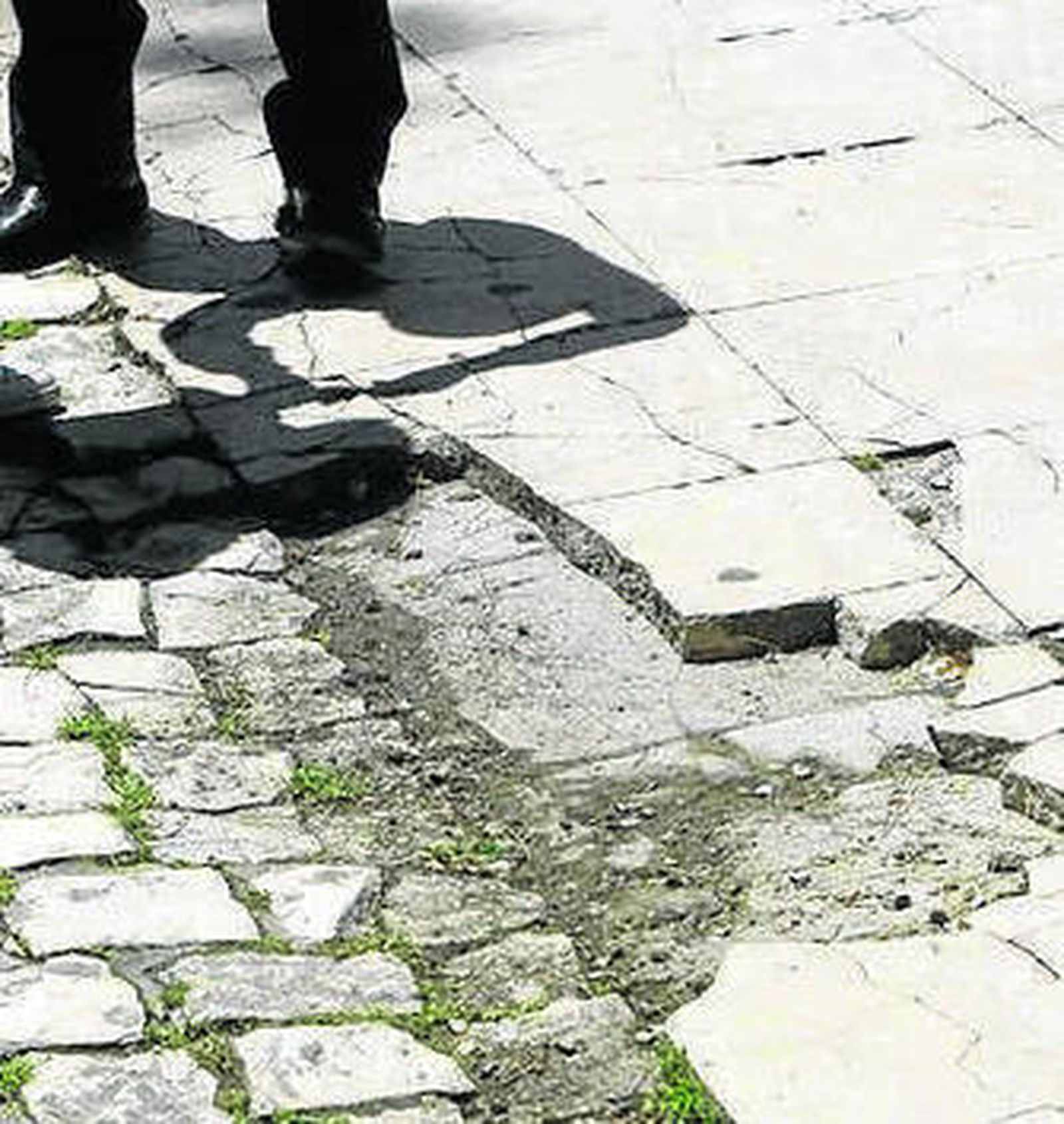 Al acercarnos por la plaza de España a las murallas, ya nos encontramos con un socavón y parches en el suelo, en el lugar en el que se une el asfalto con los adoquines, justo delante de las oficinas de la asociación de vecinos Murallas de San Carlos. Según cuenta el presidente de esta entidad, Enrique Carril, allí se acumula el agua de la lluvia y se forman grandes charcos.