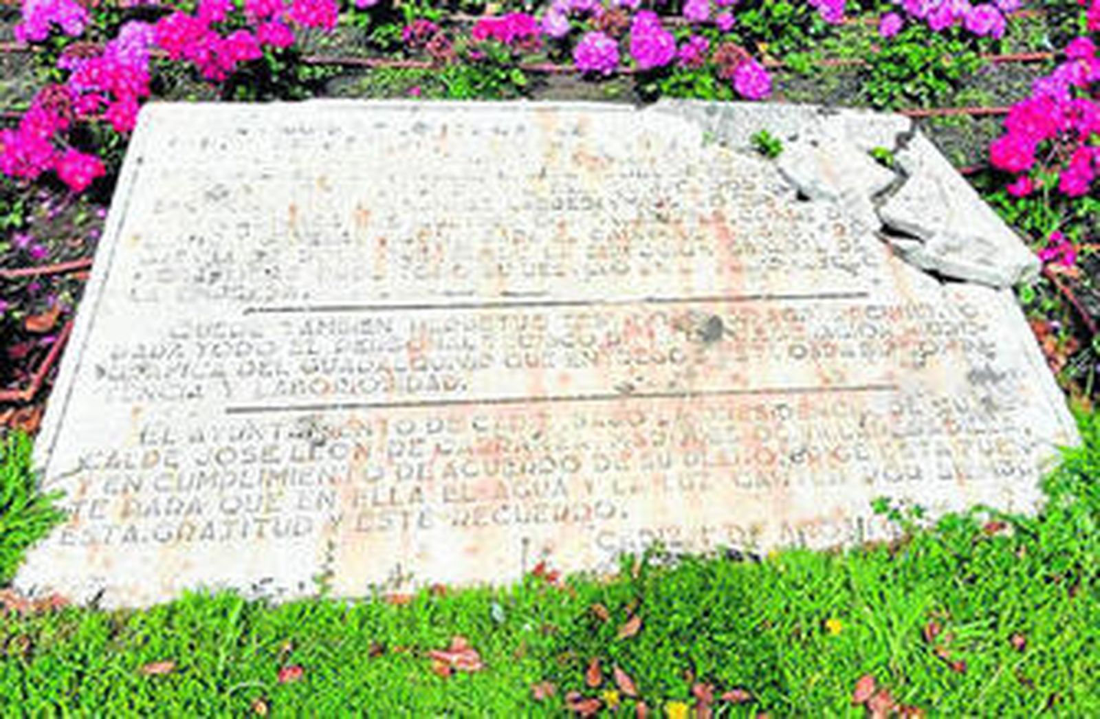 Desperfectos en la lápida conmemorativa de la construcción de la fuente de la plaza de Sevilla