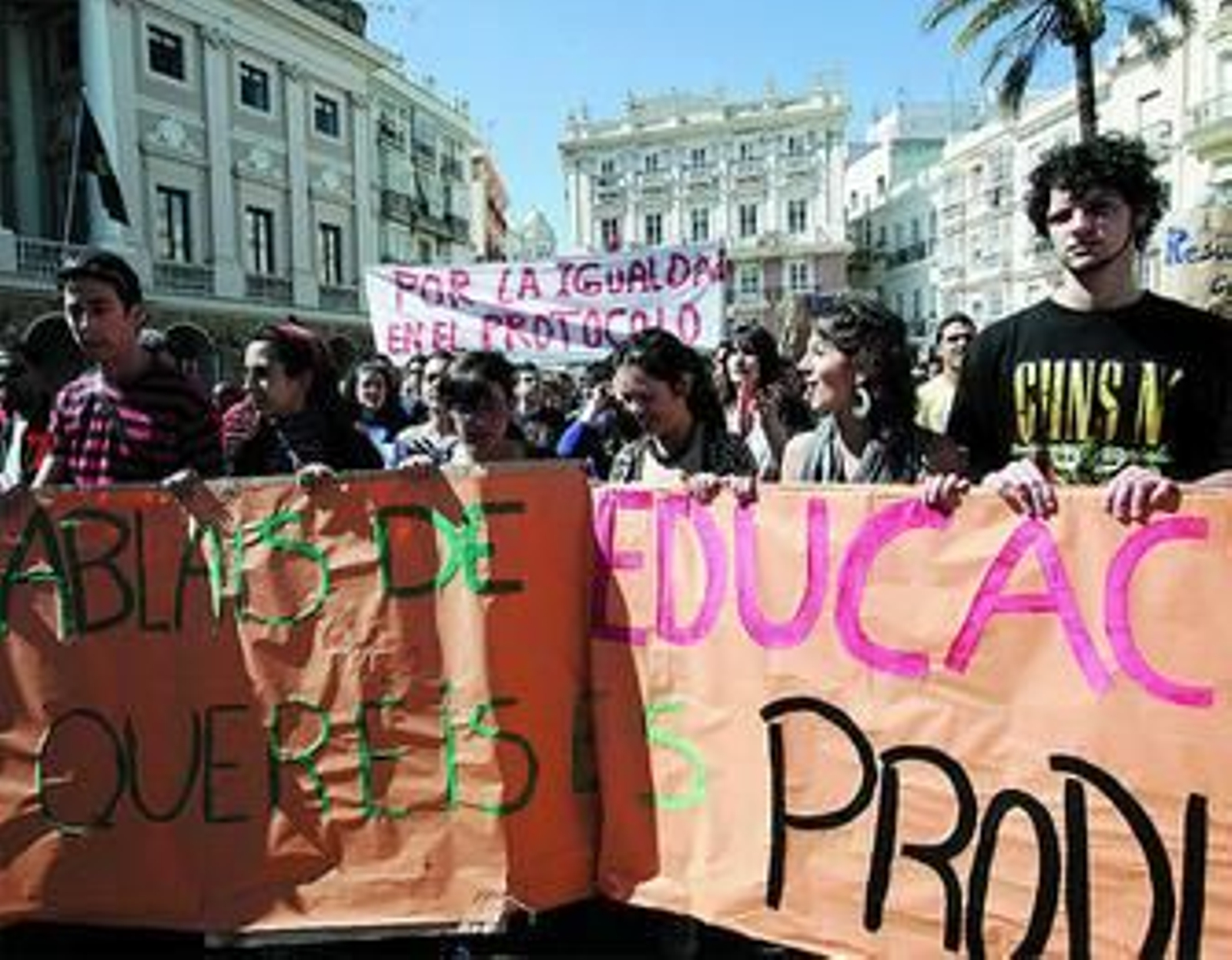 José Gallego, miembro de la Asamblea contra la Mercantilización de la Educación y uno de los portavoces de los manifestantes, destacó la lucha que están desarrollando miles de estudiantes españoles contra el Espacio Europeo de Educación Superior, así como el deseo de esos universitarios 'antibolonia' de involucrar con sus acciones a la ciudadanía, "ya que entendemos que la aplicación de esta reforma repercutirá de forma negativa en toda la sociedad". E inesperadamente, frente a la fachada del Ayuntamiento gaditano, se involucraron en su lucha el medio centenar de ex trabajadores eventuales de Delphi que, en ese momento, se encontraban allí manifestándose. "Os apoyamos de todo corazón. Como padres de familia, sufrimos en nuestras carnes el no poder enviar, por problemas económicos, a nuestros hijos a otras ciudades para que estudien lo que verdaderamente les gusta. ¡Ya está bien de tanta zancadilla al obrero! ¡Si esto no se arregla, guerra, guerra, guerra!", declaró uno de los eventuales. Los alumnos agradecieron sus palabras con aplausos y con cánticos como "¡Obreros y estudiantes siguen adelante!" y "¡El hijo del obrero a la universidad!". Acto seguido, los dos grupos decidieron fundirse en uno y emprender el camino juntos, custodiados siempre por agentes policiales.