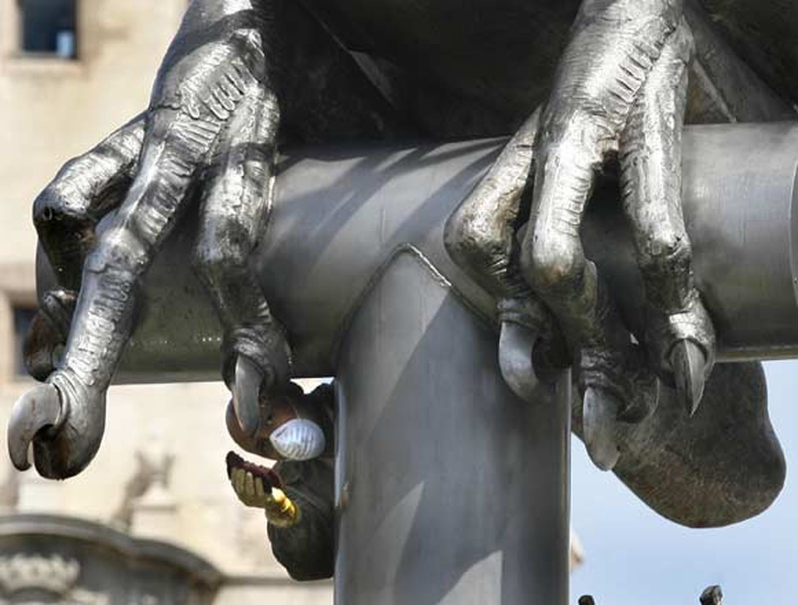 Operarios municipales estuvieron ayer sacando brillo a las patas de la escultura para eliminar, de nuevo, las manchas que le salen