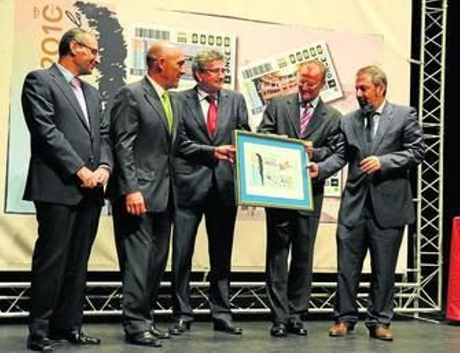 El delegado territorial en Cádiz de la ONCE, Francisco Arroyo, hizo entrega al regidor de una copia con el cupón con la imagen del Teatro. A Pizarro se le ofreció otra copia de la plancha presensibilizada con los cuatro cupones que se ponen estos días a la venta.