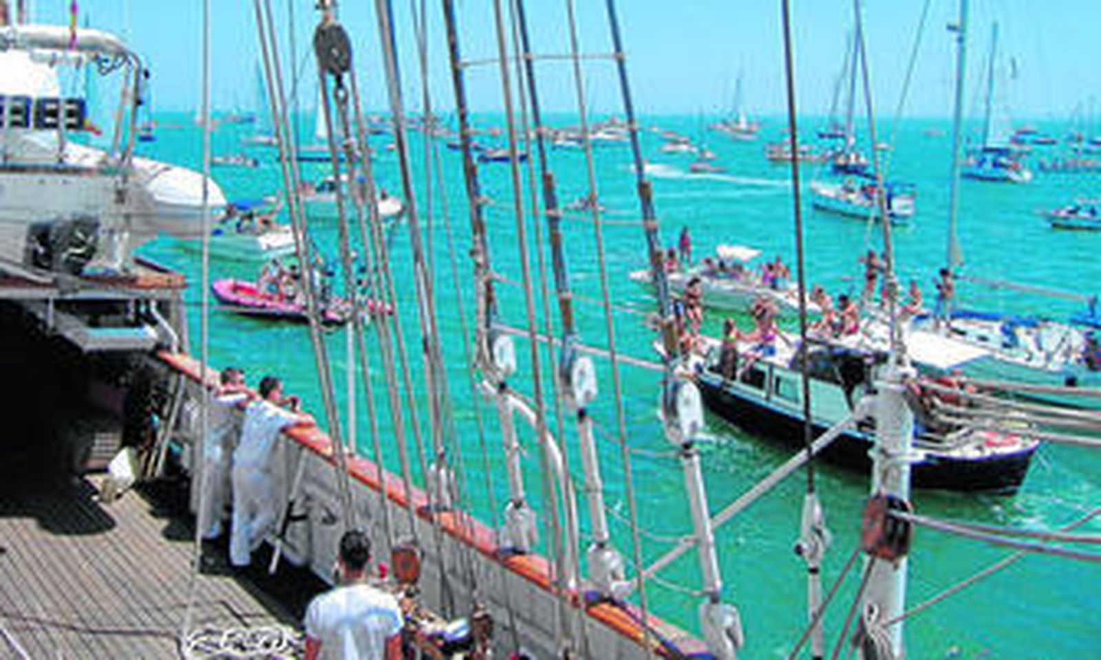 Y la del pasado domingo fue especial. Empezaba la mañana con un muelle abarrotado de personas. Desde niñas a abuelos. ¿Hacerse una foto de recuerdo en la escalinata de acceso? Complicado. Está la cosa solicitada. Un barco a vela se acerca; el primero en presentar sus honores al buque, a la vez que el único que lo realiza en el muelle. Personas varias y afortunadas que animadamente saludan a la tripulación. Saludos multiplicados por centenas en tierra, siendo devueltos, gorra en mano, por los marineros. A los pasodobles que suenan les sigue una lluvia de aplausos cuando el buque, impulsado por los remolcadores, comienza a virar. En la línea de visión aparece otro mar sobre la bahía, pero este de veleros, yates, pequeñas embarcaciones, zodiacs y motos acuáticas. Poco a poco las personas del muelle empequeñecen, pero su número sigue impresionando, y serán otros grandes veleros como el 'Américo Vespucci', el 'Mir' o el 'Sagres' los que recibirán su cariño.