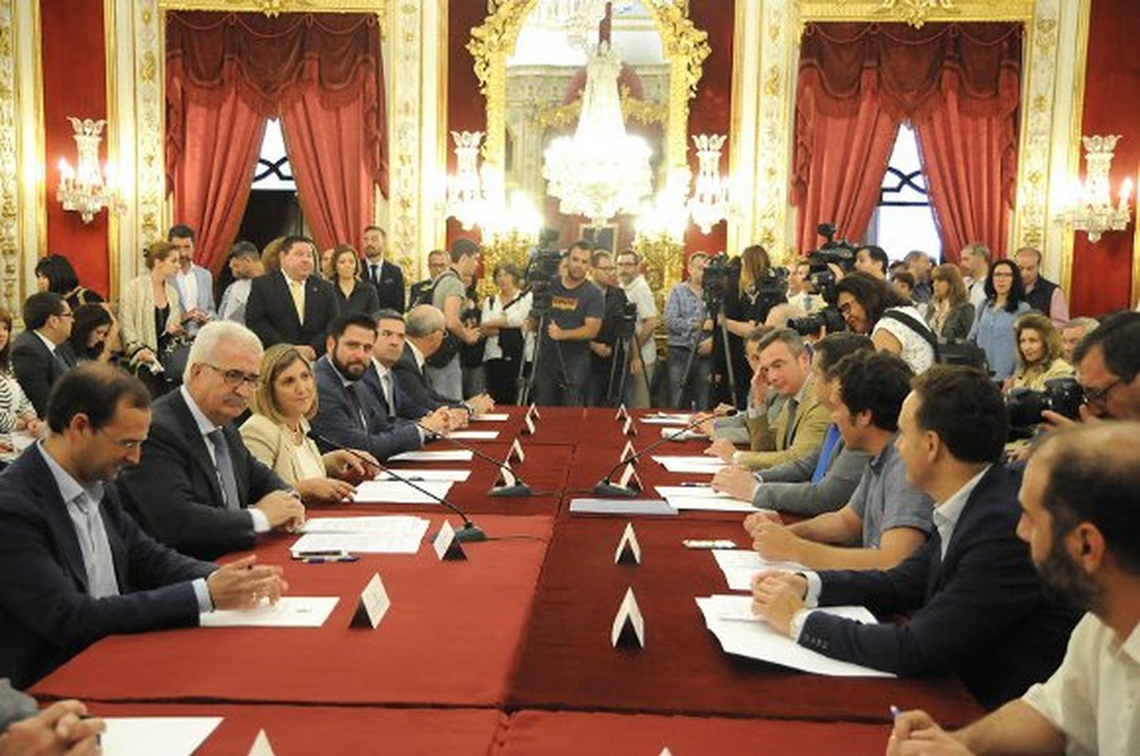 La puesta de largo del Tricentenario, con la firma del protocolo de la conmemoración, une a los representantes de las distintas administraciones vinculadas a Cádiz en una foto histórica