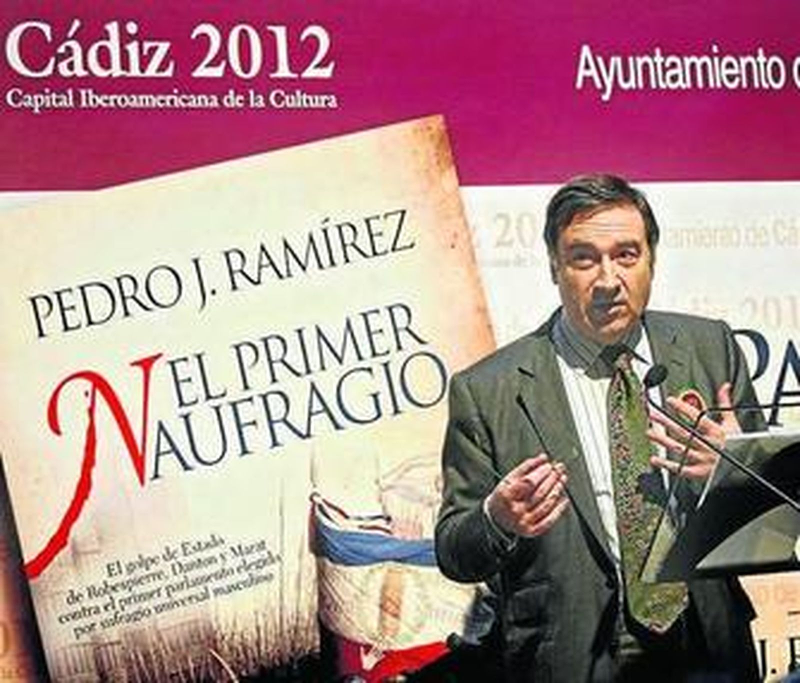 El patio interior del Casino Gaditano estaba lleno -aunque no se quedó nadie fuera- con gente de pie e incluso sentada en la escalera. Cerca de 300 personas. El acto lo abrió la alcaldesa de Cádiz, Teófila Martínez, que reconocía que era "una tarde muy esperada desde hace tiempo". Definió a Ramírez como "un periodista de raza" y habló sobre la libertad de prensa que se reconoció por primera vez en el texto de 1812. A todo esto el invitado asentía con la cabeza y compartía copa con su esposa, la diseñadora Ágatha Ruiz de la Prada, que lucía uno de sus modelos tan característicos y coloridos. Mientras, en una pequeña mesa, la librería Manuel de Falla vendía algunos ejemplares del último libro publicado de Pedro J. Ramírez, El primer naufragio, sobre el golpe de Estado de Robespierre, Danton y Marat contra el primer parlamento elegido por sufragio universal masculino.