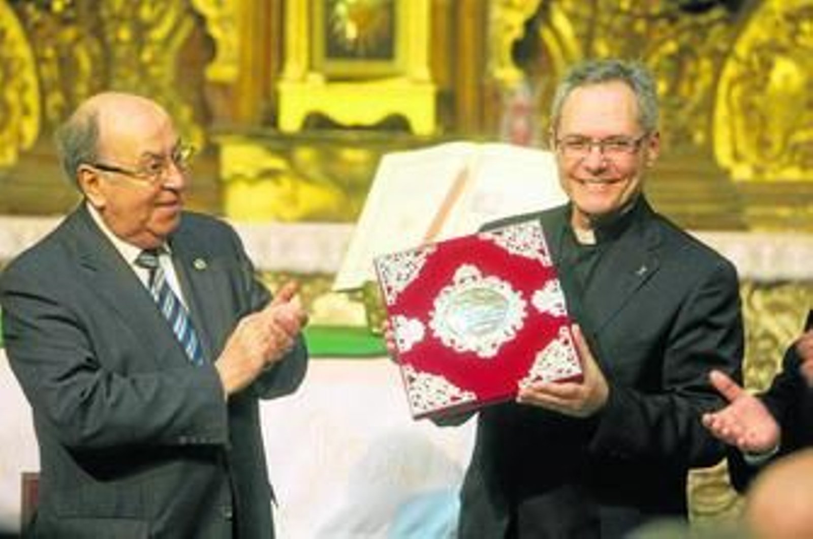 Con este sorpresivo gesto, Pérez Godoy aportó un grano más al acto de entrega de las cubiertas de orfebrería que la tertulia cofrade Al Palo llevó a cabo en la iglesia de La Pastora, donde el pregonero confesó sentirse "abrumado de tantos actos" como está protagonizando en los últimos días, debido a una agenda más apretada de lo habitual porque el sacerdote salesiano marchará mañana a Roma a participar en el capítulo general de los salesianos, no regresando ya hasta las vísperas del pregón.