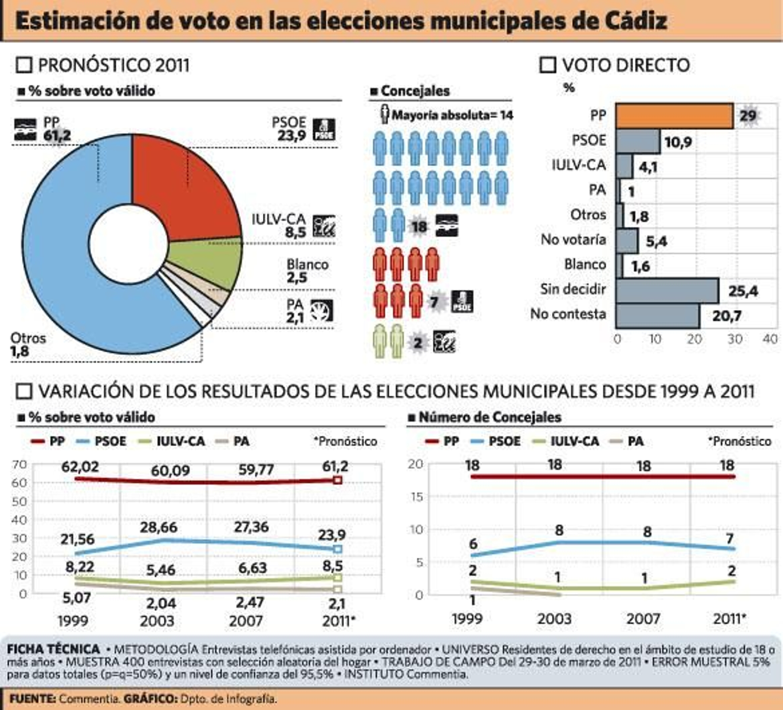 El PP volverá a gobernar con absoluta comodidad el Ayuntamiento de Cádiz los próximos cuatro años, al igual que ha venido realizando de manera ininterrumpida desde 1995. Según un sondeo realizado por la empresa Commentia para este diario, la lista que encabeza Teófila Martínez revalidará el 22 de mayo la mayoría absoluta y, además, lo hará repitiendo los 18 concejales que esta formación ha mantenido en el salón de plenos del Ayuntamiento gaditano los tres últimos mandatos corporativos. Cabe recordar que el Ayuntamiento de Cádiz cuenta con 27 concejales, por lo que la mayoría absoluta la marca la cifra de 14 ediles.