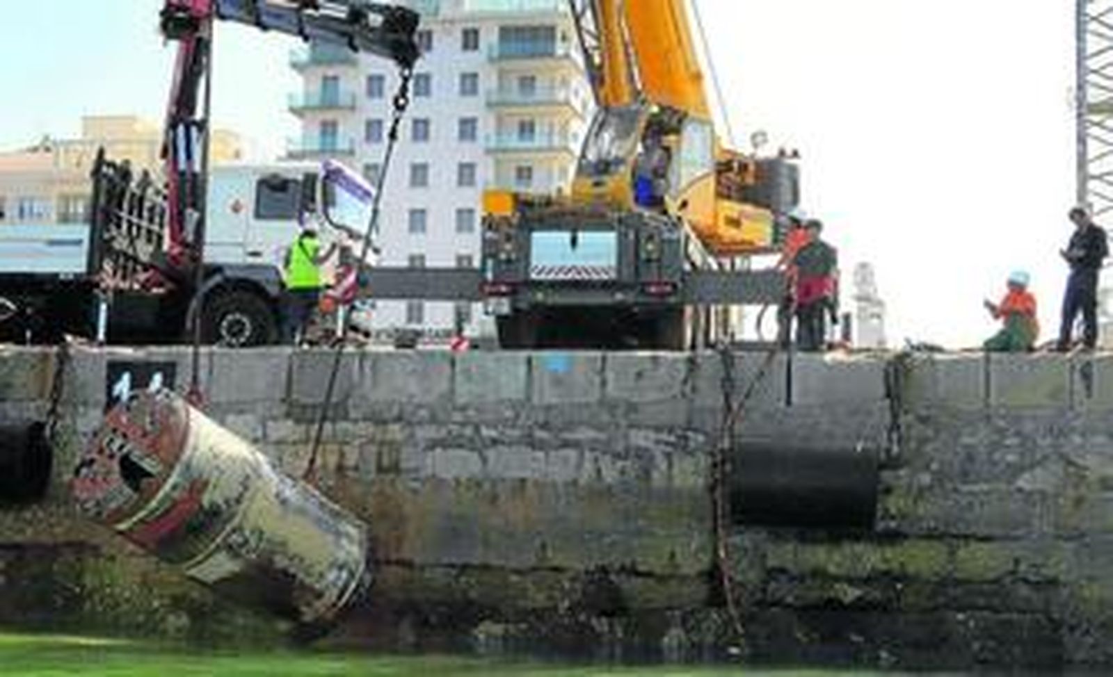 Un equipo de buzos retiró ayer del Muelle la maquinaria utilizada para el aliviadero de pluviales, poniendo así fin a la primera fase de esta actuación de Aguas de Cádiz