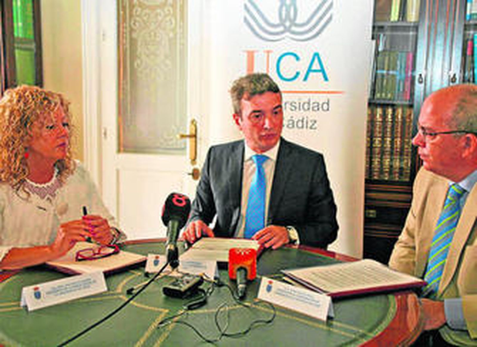 El rector de la Universidad de Cádiz, Eduardo González Mazo, la presidenta del Consejo Social de la UCA, Ana Alonso Lorente, y el presidente de la Confederación de Empresarios de la Provincia de Cádiz, Javier Sánchez Rojas, firmaron ayer un convenio marco de colaboración para impulsar la segunda edición del programa Proyecta que establecerá los mecanismos permanentes de diálogo e interlocución que favorezcan las relaciones en materia de I+D+i entre la docencia e investigación universitarias y los sectores empresariales de su entorno.