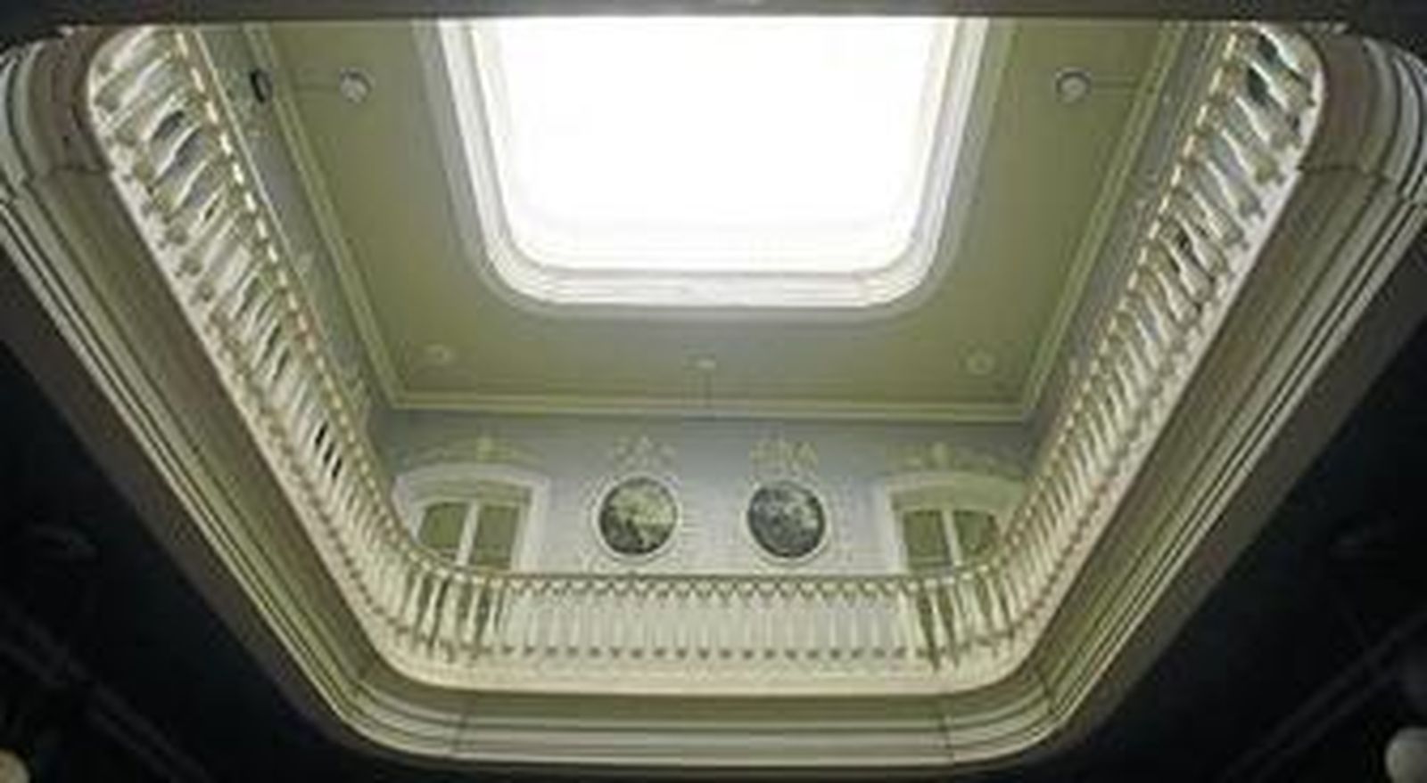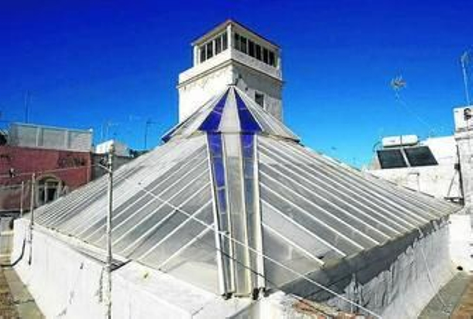 La segunda planta no está acondicionada, así que dejamos atrás ese laberinto de pasillos que se vislumbra desde la escalera y seguimos subiendo hacia la azotea. Nos da la bienvenida la enorme montera, instalada en la segunda mitad del siglo XIX; y a la derecha, colindando con la calle Vea Murguía, se erige la torre mirador. Los edificios que rodean a esta finca impiden que divisemos el horizonte gaditano. Pero a nuestra espalda nos aguarda una sorpresa. Las altas palmeras que habitan en el jardín del histórico recinto han hecho un esfuerzo por asomarse a la azotea, y sus finos y alargados troncos bailan al son del viento.