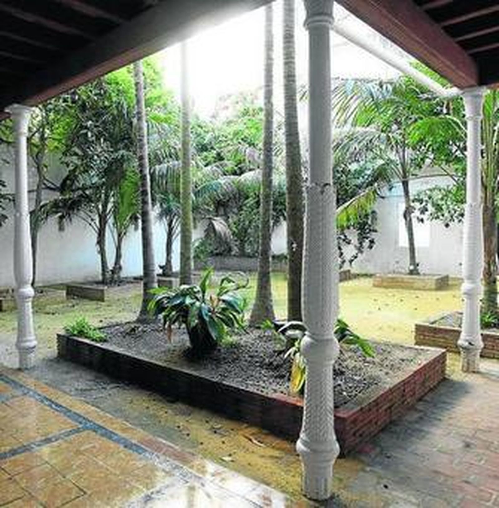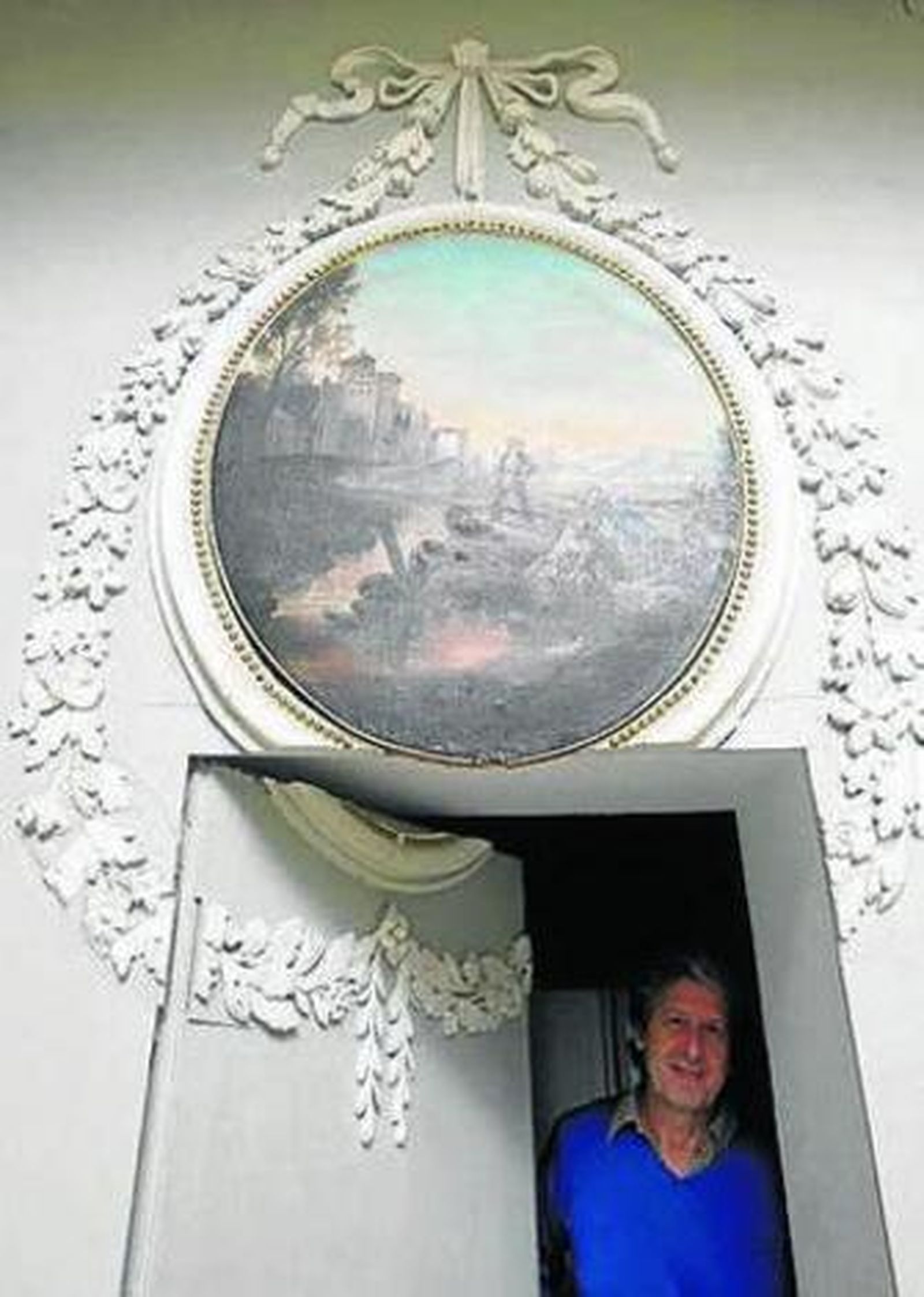 La ex propietaria de Veedor, 3 frena nuestros pasos una vez alcanzamos el centro del patio de entrada y nos invita a mirar hacia arriba. Se asoman los blancos barandales de las galerías de la primera y la segunda planta, y en un segundo plano contemplamos unas pinturas ovaladas enmarcadas con distinguidas guirnaldas de escayola que representan motivos florales. "Son nueve pinturas de paisajes realizadas al óleo por José Camarón. Cuando Fernando y yo compramos la casa a la familia Aramburu, las tuvimos que restaurar porque estaban hechas jirones".