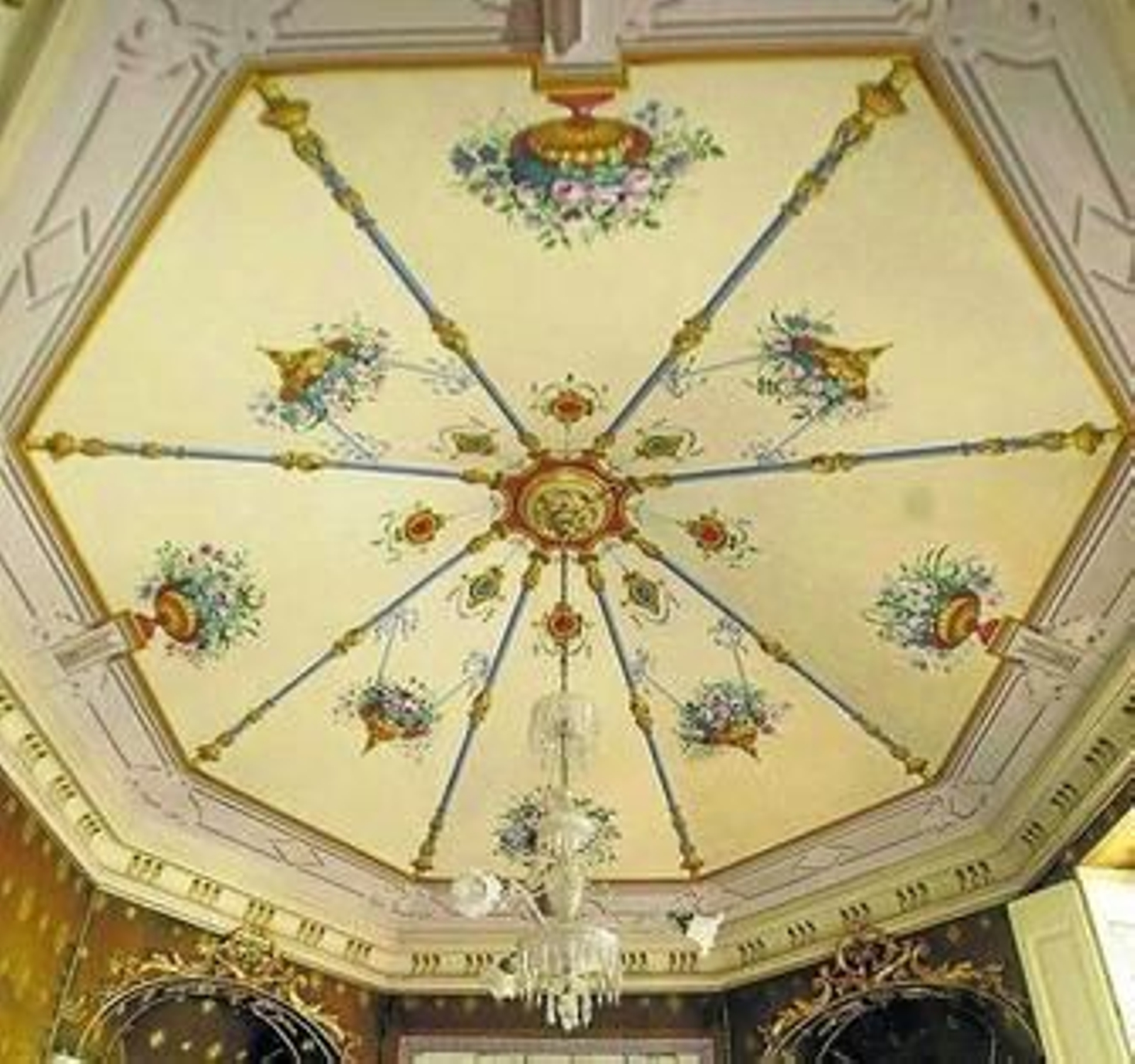 A Susi le apasiona el arte y la historia de este palacete. Con especial entusiasmo habla de la sala de estar destinada exclusivamente a las damas: "Ésta es una sala que recibía el nombre de buduá y en la que se reunían las mujeres para leer o coser mientras sus esposos conversaban en el salón". Esta habitación está tapizada con una seda que, según la ex dueña, era de color verde esmeralda, aunque no es ése el tono que conserva actualmente. La potente claridad que se cuela por el cierro y el paso del tiempo han empobrecido la tonalidad. Pero el precioso techo luce saludable. La pintura con motivos florales está perfectamente conservada.
