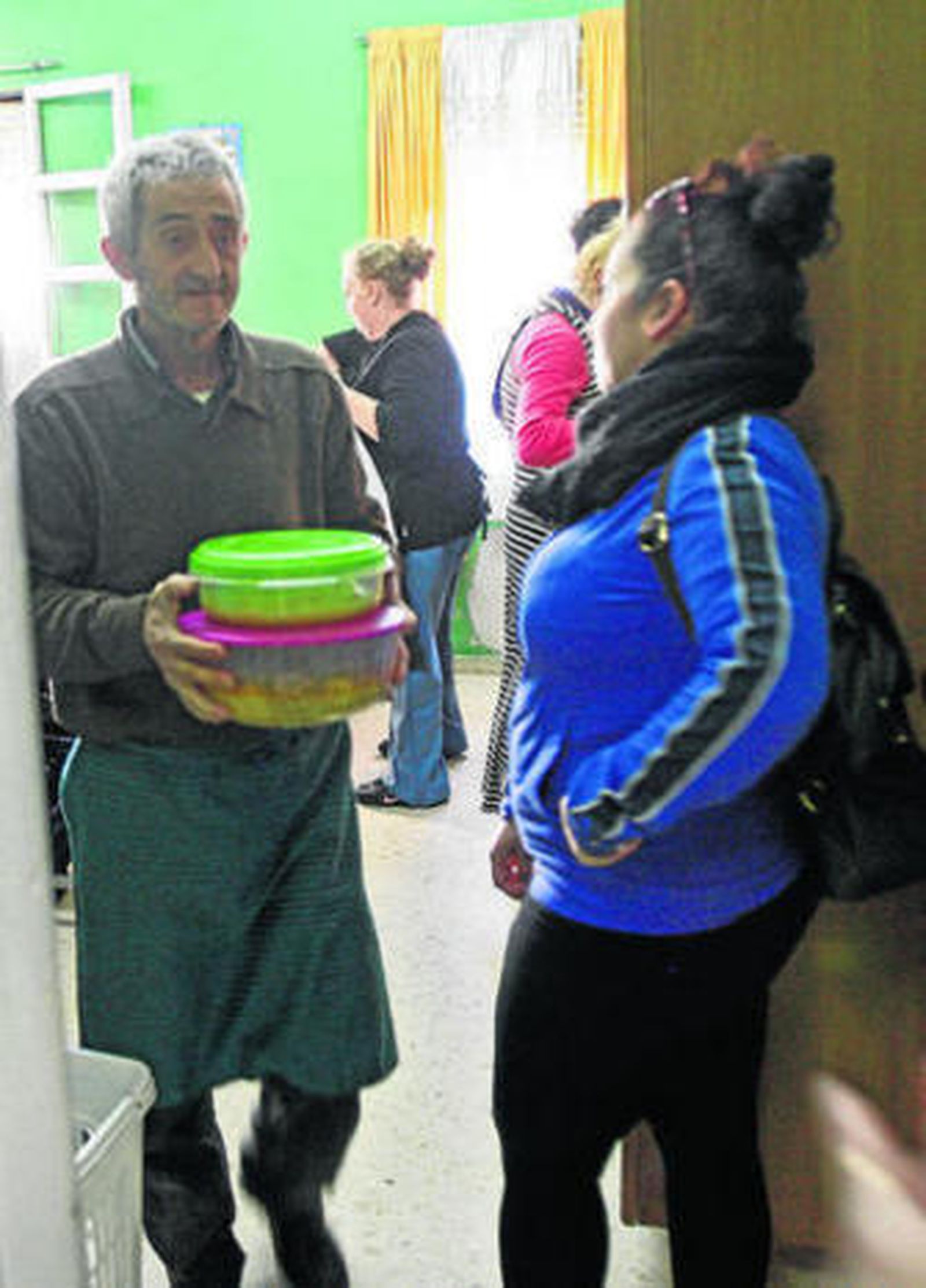 "Normalmente no se forma cola porque ya tienen la hora cogida y vienen espaciadamente", comenta Pepa. Esta mujer indica que la mayoría de las personas a las que les llenan las fiambreras los martes y jueves son las mismas a las que les reparten comida del Banco de Alimentos y de Cruz Roja. También dan de comer a varios transeúntes.