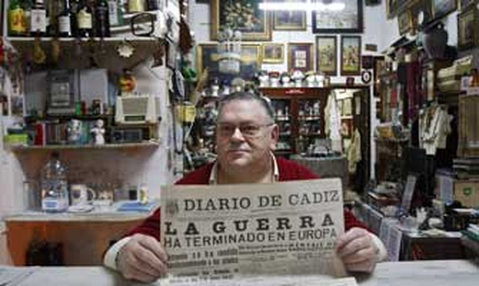 En el túnel del tiempo que tiene José Mariano Gómez del Castillo en la esquina de Torre y Santa Inés hay cabida para 147 años de 'Diario de Cádiz'. No podía ser de otra forma. El conocido propietario de lo que fue un ultramarinos y ahora es una ventana al pasado de esta ciudad es un coleccionista de casi todo lo que cae en sus manos. Si tiene que ver con Cádiz, mejor. Y José Mari, al que contemplan 54 años en tan emblemático establecimiento, guarda como tesoros ediciones antiguas de este Diario. Como la que utiliza para posar en la foto, una del 8 de mayo de 1945 en la que se anuncia "La guerra ha terminado en Europa". "Me la regaló Antonio Pérez Sauci", explica quien fue un buen amigo del recordado periodista.