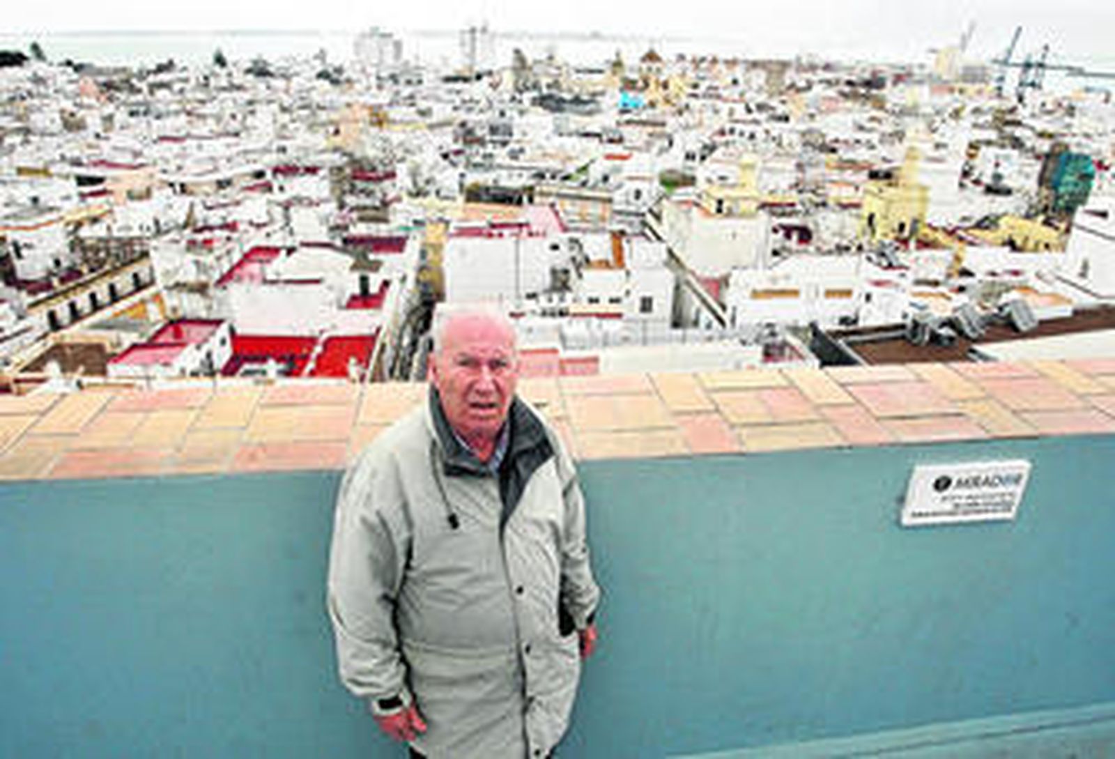 Sube de una tacada los 173 escalones que hay desde la planta baja hasta la azotea de la Torre Tavira. Habla sin parar durante todo el trayecto, mientras que los que le seguimos comenzamos a notar el mal de altura a partir del escalón número 100. Señala cada rincón y recuerda lo que había cuando él era el 'dueño' de la casa. Mira a su mujer que, a duras penas, asiente. Llega a la azotea y no le amilana la lluvia que va cayendo, cada vez con más intensidad. En una esquina estaba una pequeña caseta en la que se encerraba los días de más frío, recuerda, y que estuvo a punto de volar por los aires aquella jornada en el que un tornado hizo temblar la ciudad. Le pido que se haga ya las fotos, que nos estamos mojando.