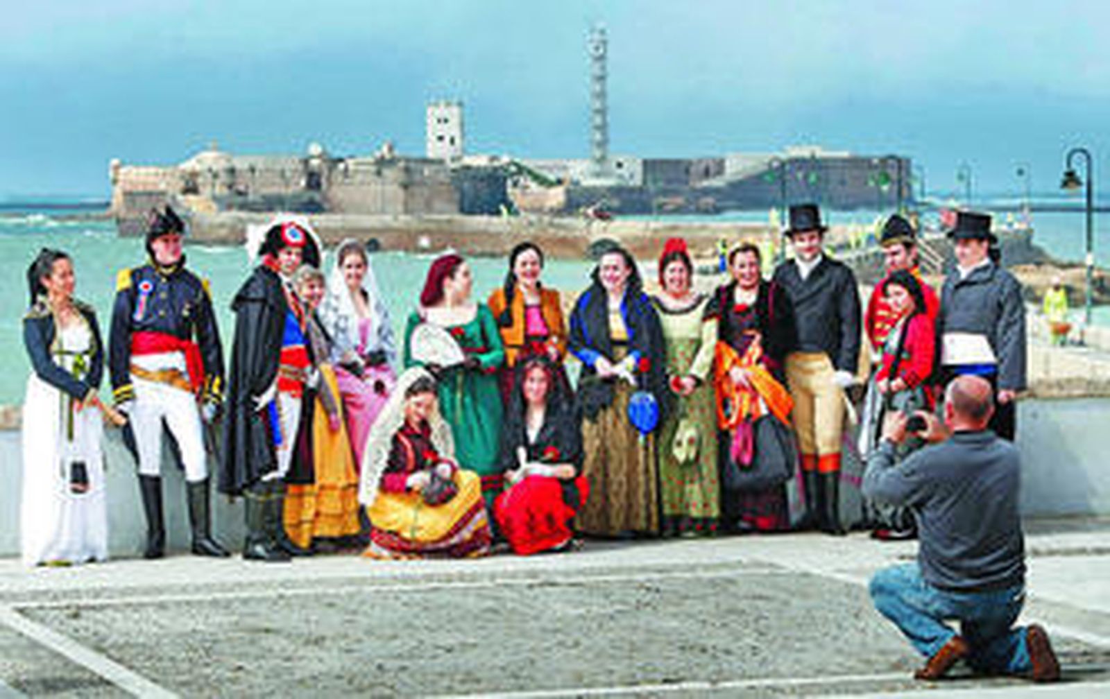 "¿Qué es lo que hay hoy en Cádiz?" Un participante en la prueba de la Gymkana se pone una madroñera para meterse en el tipo. No es el Carnaval, pero se le parece. En la playa de La Caleta un grupo de catalanes vestido de la época doceañista posa para hacerse una foto con el castillo de San Sebastián de fondo. Lamentaban no haber podido hacer el paseo Fernando Quiñones andando porque las obras inacabadas del castillo se lo impide.