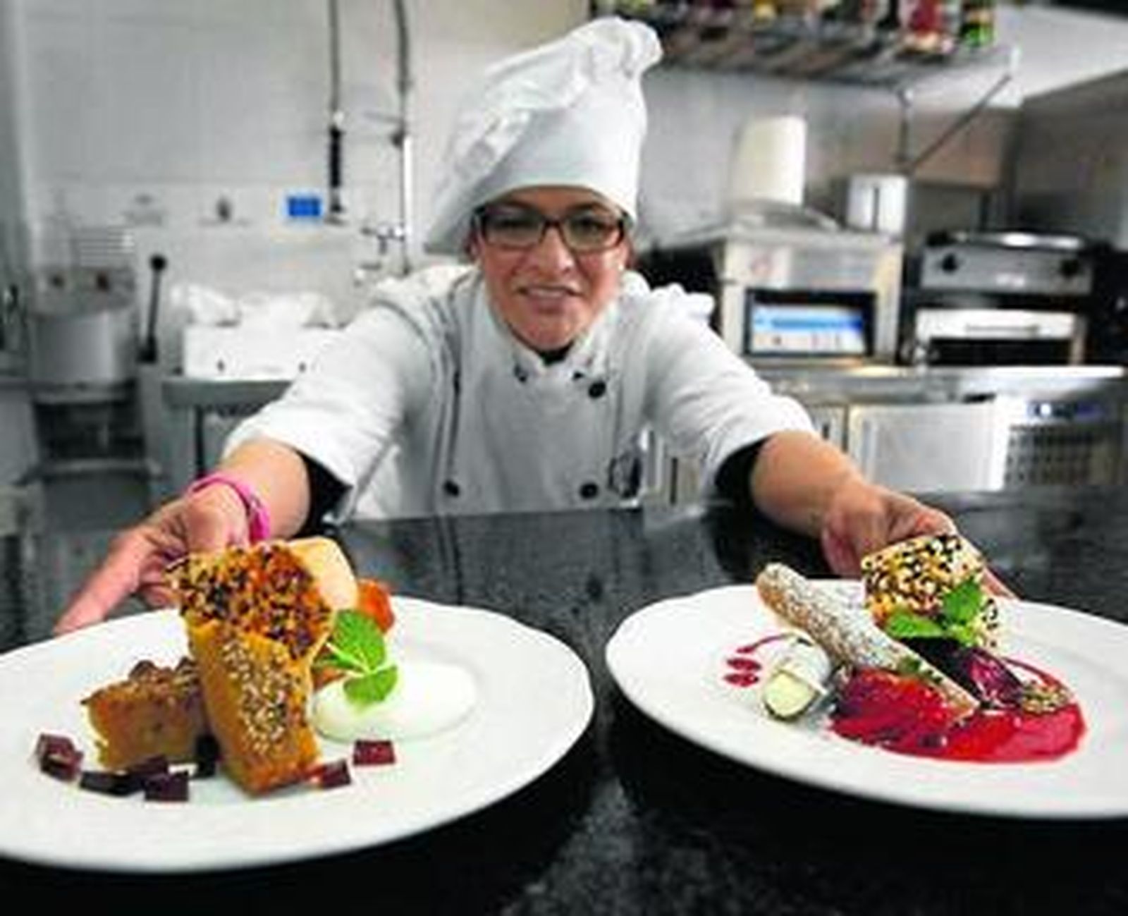 Los postres del Doce también tienen su espacio en estos menús. Auxiliadora Moreno, profesora de pastelería, muestra una de las pruebas de presentación de los dos postres a elegir esta semana: Dulce de calabaza con helado y nata agria (del siglo XIX) y Canutillos rellenos de mouse de queso Payoyo y helado de fresas en vinagre de Jerez (actual). En realidad, "son postres típicos de la época que se hacían con los productos que tenían a mano", comenta la profesora, y en la escuela los han actualizado. Los platos están en la mesa, listos para servirse.