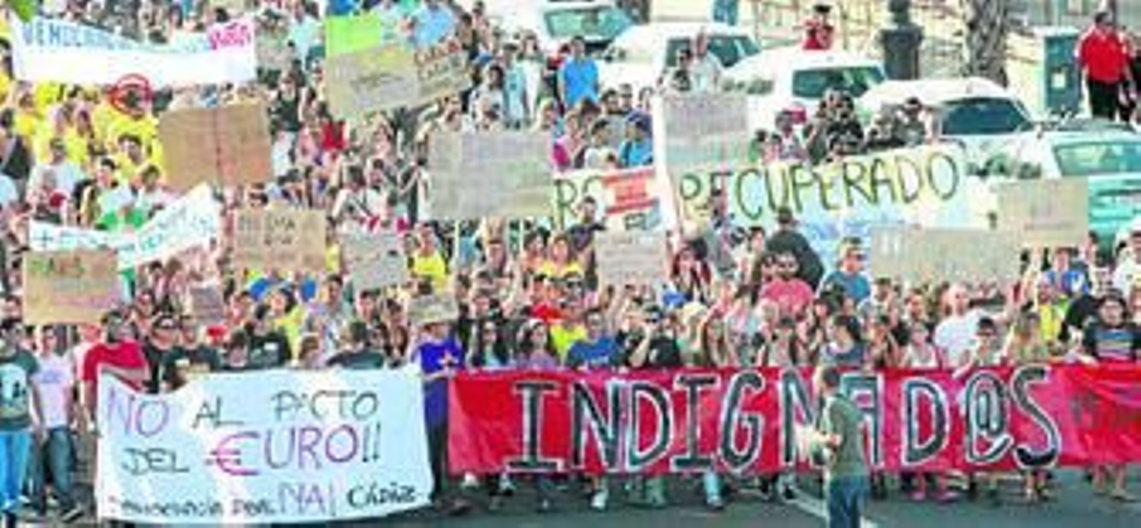 Hartos de pagar con recortes sociales la crisis económica, del capitalismo, de los banqueros, los políticos, las decisiones de la Unión Europea, la corrupción... Muchos motivos hicieron que ayer más de 4.000 gaditanos, según datos de la Policía Local, se unieran en la marcha organizada por Democracia Real Ya para protestar contra el llamado Pacto del Euro, un paquete de medidas concretas para cada país que presumiblemente será ratificado en el Parlamento Europeo el próximo día 27.