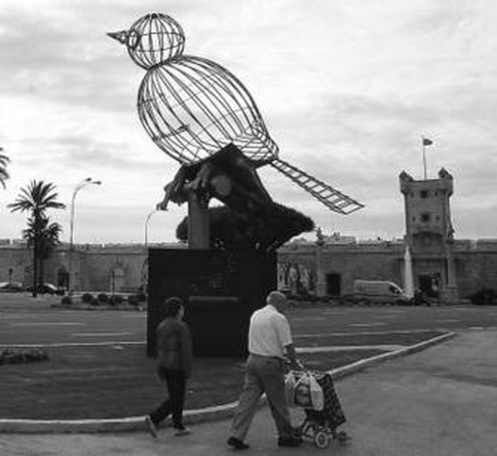 "Fíjate si es carajote el gorrión que trae hasta jaula, como los kits de herramientas, y en permanente postura de esperar el 2 pa la Zona Franca. Qué mejor sitio que a la vera de Hacienda, con la de pájaros que hay en Hacienda". El Libi, tras unos días de observación y reflexión, sostiene que el pájaro viene ya oxidado, embolado, poco ágil, encarajotao, en flexión como pa echarse, y se pregunta cuánto habrá costao tamaña maravilla de la creación. "Menos mal que lo han hecho sin plumas, que si no, ya tendríamos el disfraz del año, tol mundo iría de plumas aprovechando las mudas del gachó. Yo creo, hablando ahora en serio, que el nivel de la grifa ha bajado mucho en Cádiz".
