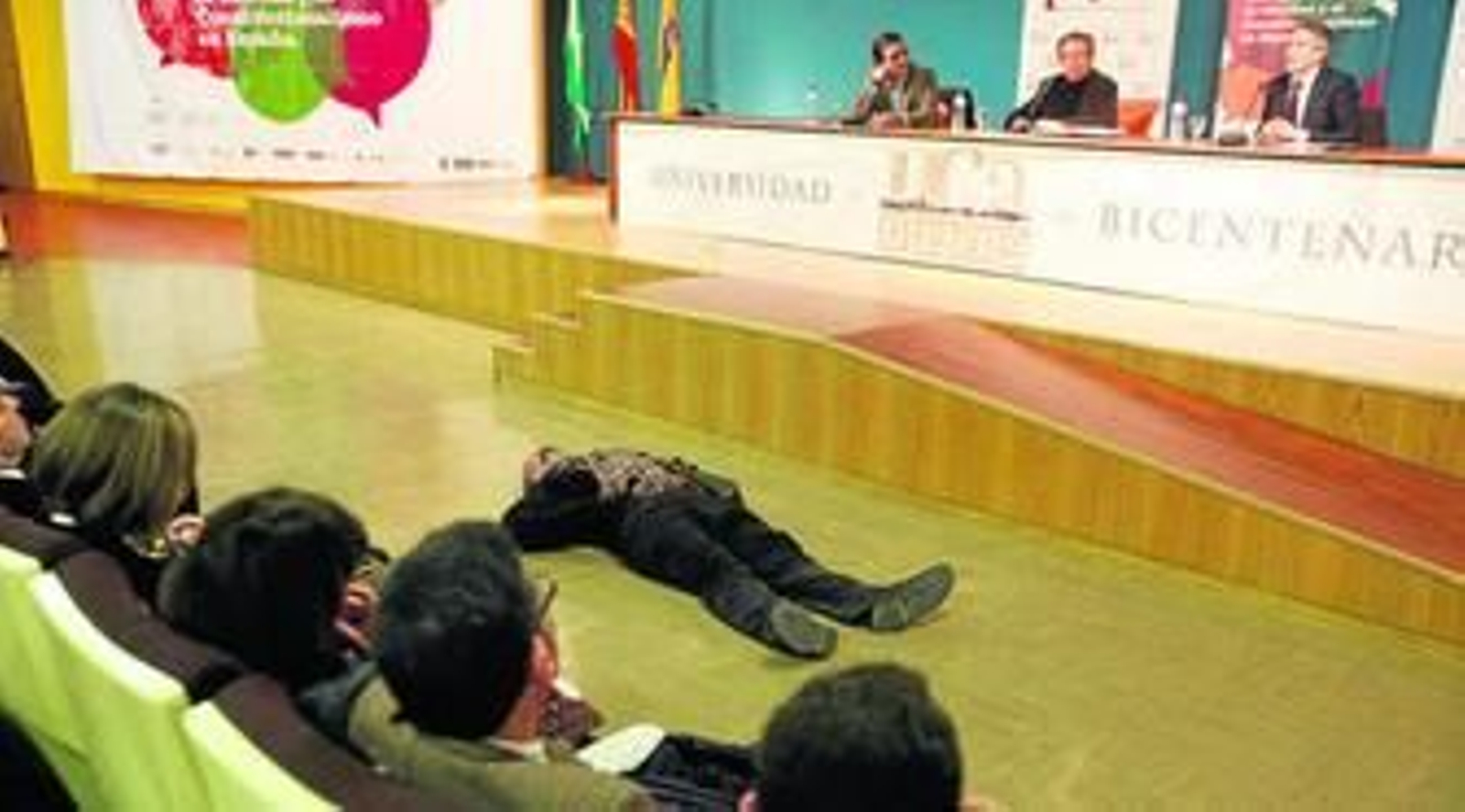 Un activista de Valcárcel Recuperado se tumbó en el suelo durante los Diálogos sobre la Libertad en el que se produjo la carga policial.