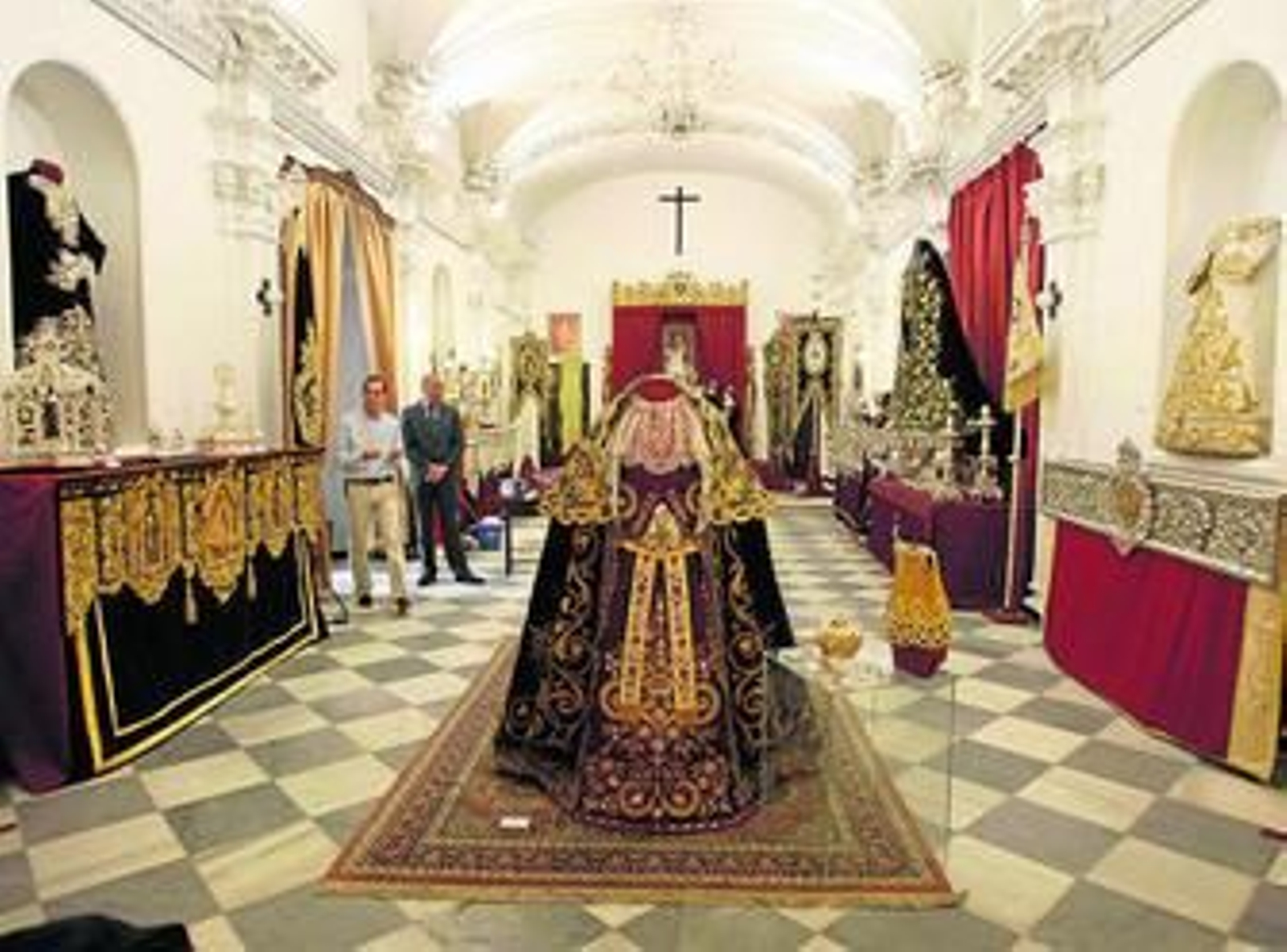 La otra pata que se encontrarán los que visiten el convento de Santo Domingo será la exposición cofradiera con enseres de catorce corporaciones de Cádiz y San Fernando. Una muestra de algunas de las piezas que se ven en la calle durante la Semana Santa o durante el resto de procesiones que salen durante el año. Piezas que van desde la orfebrería al bordado, pasando por la imaginería o la talla, y que se realizaron siglos atrás o en los últimos años. La pena de la Virgen de la Luz, el respiradero bordado del palio del Amor, el remate de la urna del Santo Entierro de San Fernando, los medallones de pertiguero de Vera-Cruz o el Sinelabe de Cigarreras son tan solo simples ejemplos de lo que se expone en la sala de la orden tercera de Santo Domingo, que cuenta con sesenta piezas de destacado valor.