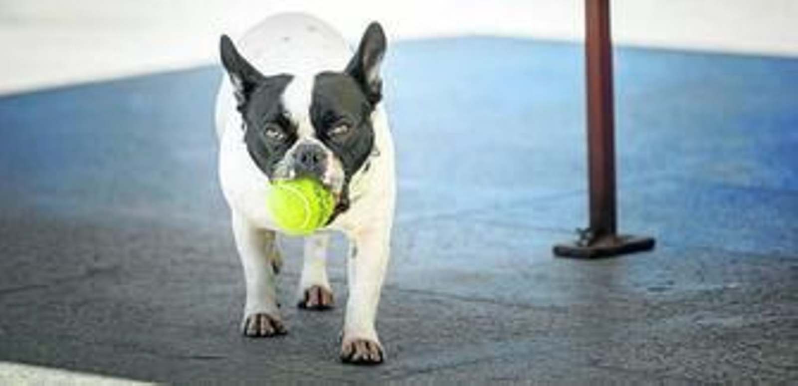 Un perro juega con una pelota en una de las calles de la ciudad.