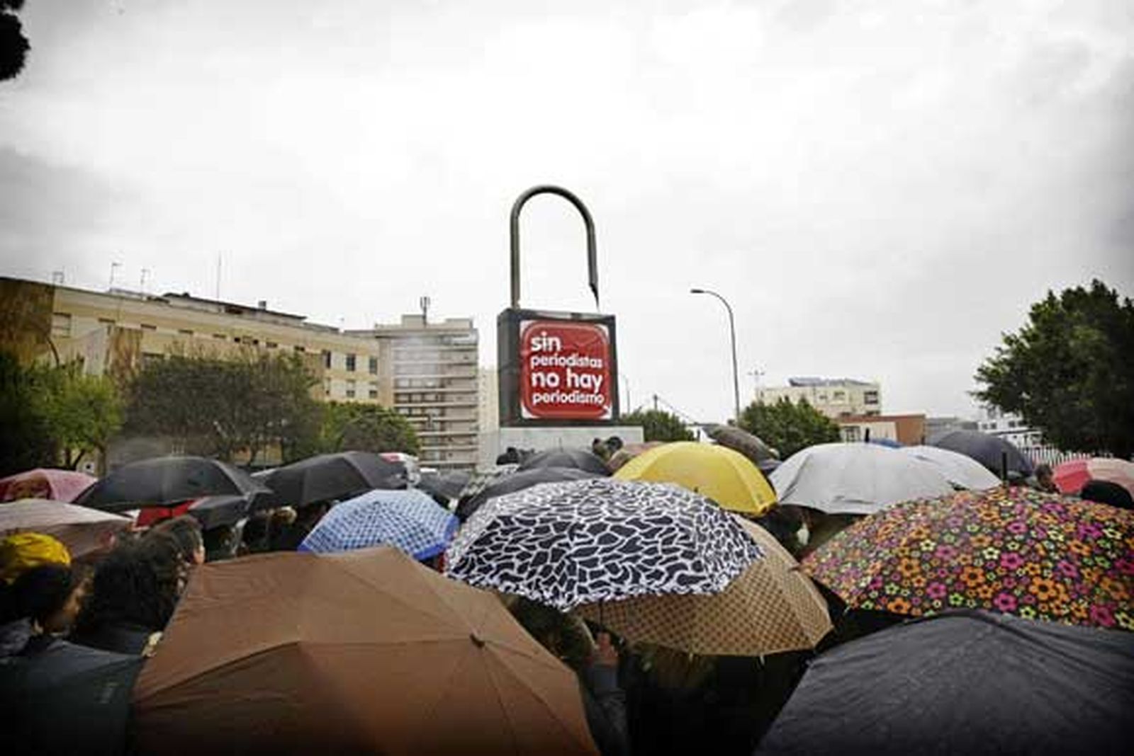 Los periodistas gaditanos se mojan, hoy más que nunca, contra la precariedad laboral y el desempleo en el sector. Ni la lluvia pudo impedir que unos 200 profesionales de la comunicación participaran esta mañana en la concentración llevada a cabo en la glorieta de los Periodistas de la capital con motivo del Día de la Libertad de Prensa.