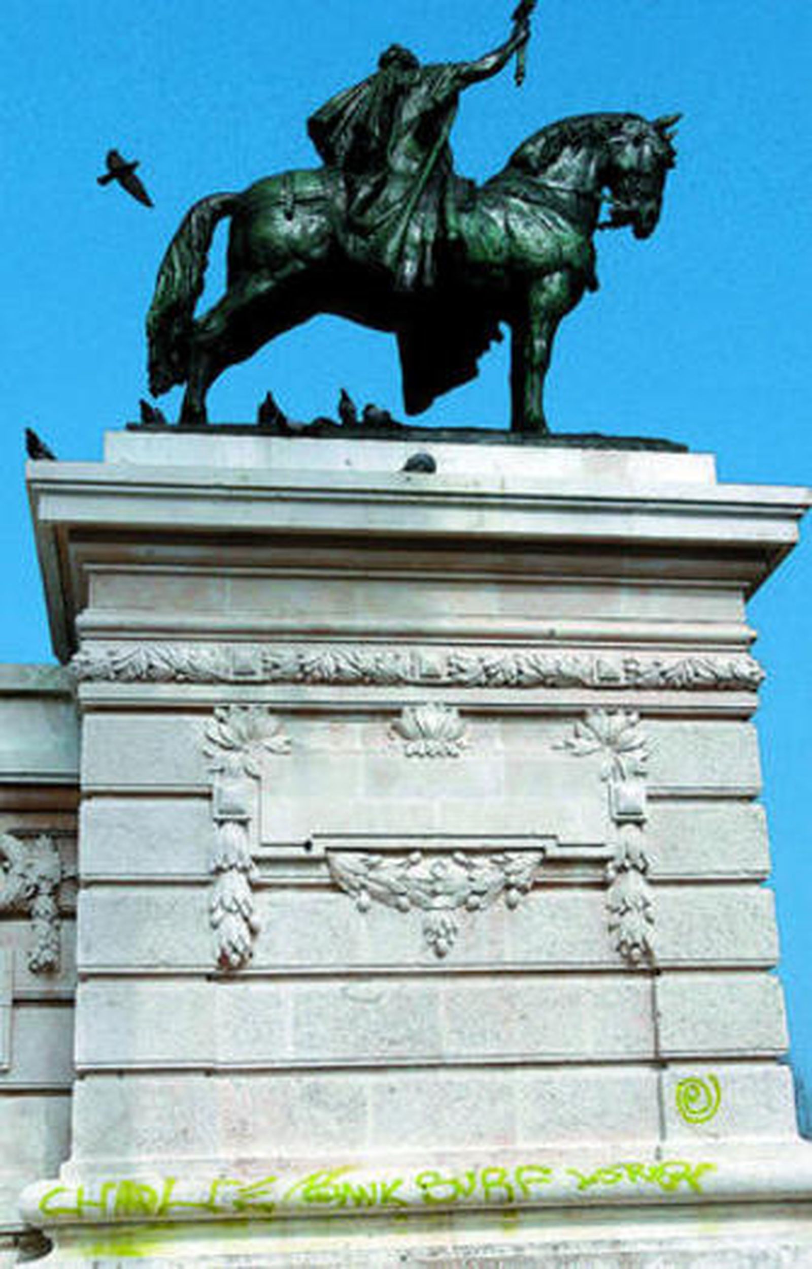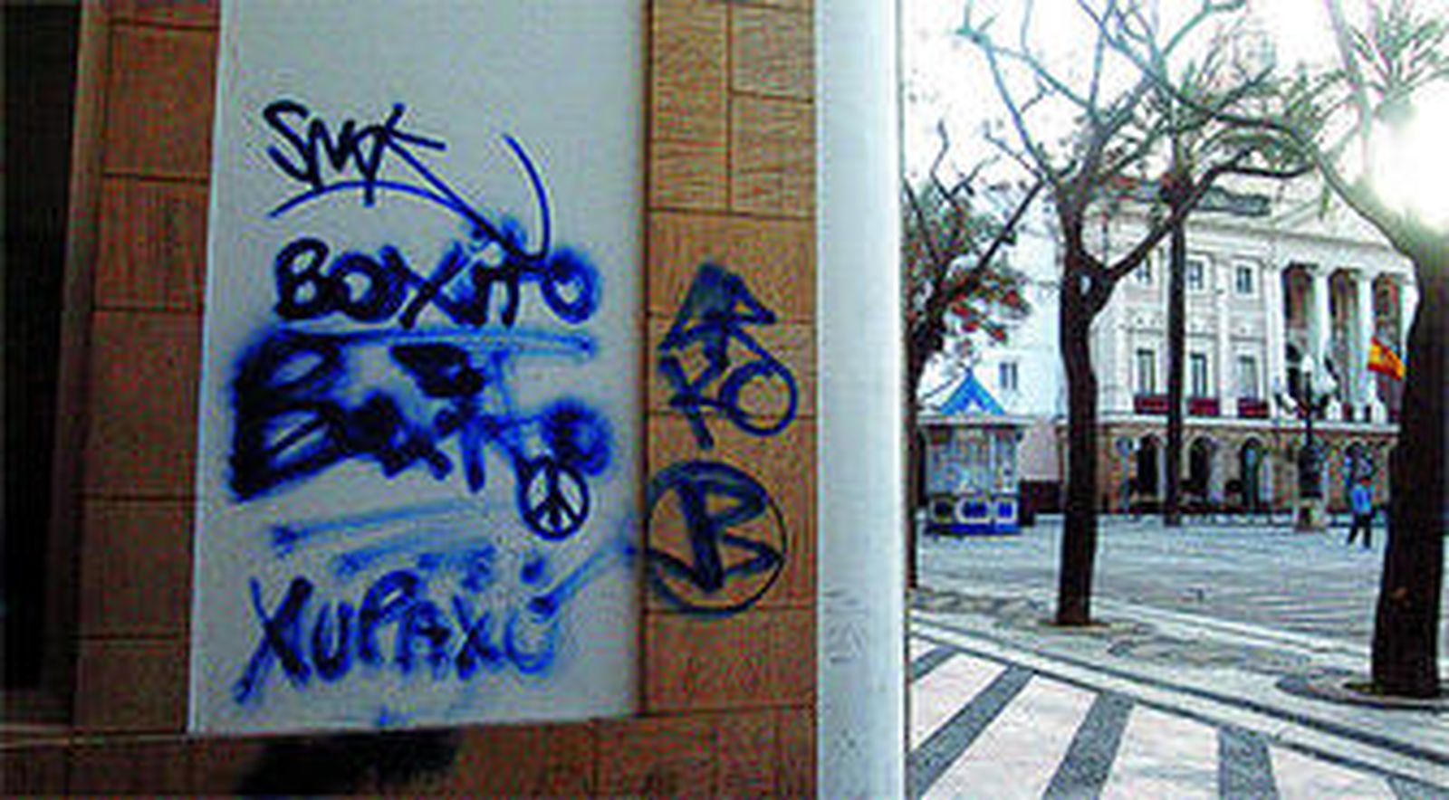 En la tarde de ayer, y en el tramo de los soportales de la avenida de Ana de Viya, se podían contar más de doscientas pintadas. Es una de las zonas donde más ha aumentado esta práctica incívica que, además, no perdona a edificios oficiales donde, se supone, hay una seguridad permanente: como las fachadas del Ayuntamiento y de la Audiencia Provincial, o en mobiliario urbano como los carteles de información turística o los paneles que protegen a las torres de la iluminación de Navidad y Carnaval de la Avenida.