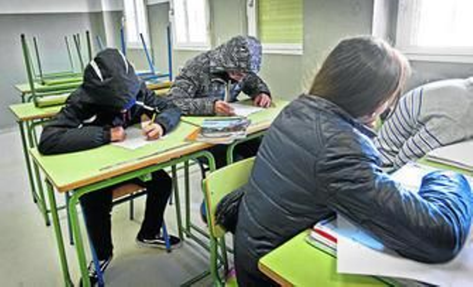 Recorrer el instituto no invita en ningún momento a desprenderse de la ropa de abrigo, más bien todo lo contrario: apetece cerrarse el chaquetón y taparse con la bufanda. La sensación gélida es más acusada en los pasillos pero se hace patente también en las aulas, donde pocos alumnos se atreven a pasar la mañana sin chaquetas o anoraks.