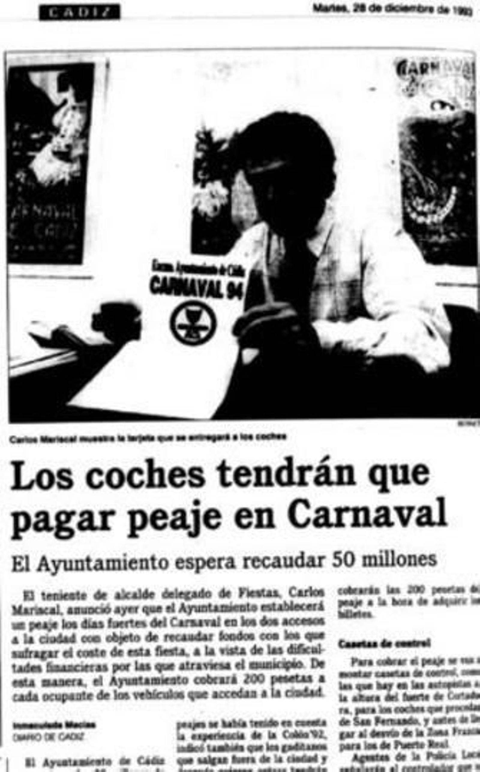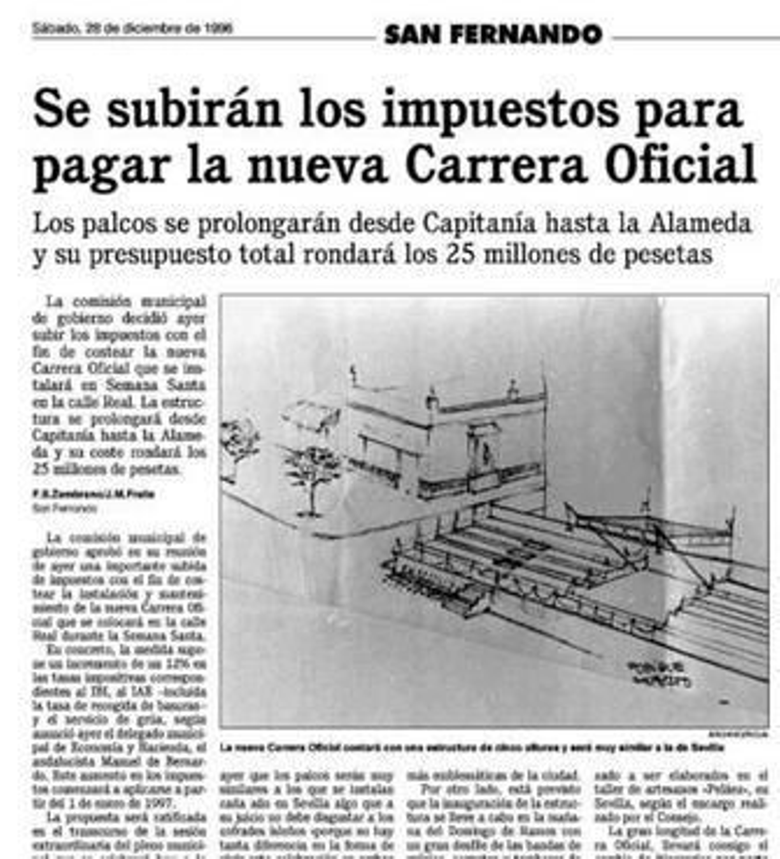 Y en San Fernando también se montó una buena cuando a la Delegación de este periódico se le ocurrió ese mismo año de 1996 informar de que habría una subida generalizada de impuestos para pagar la nueva Carrera Oficial, que se extendería desde Capitanía hasta la Alameda y que costaría unos 25 millones de pesetas. La inocentada añadía también que la nueva Carrera Oficial iría cubierta con una lona para evitar que se pudieran ver los desfiles procesionales desde los balcones de los edificios contiguos.