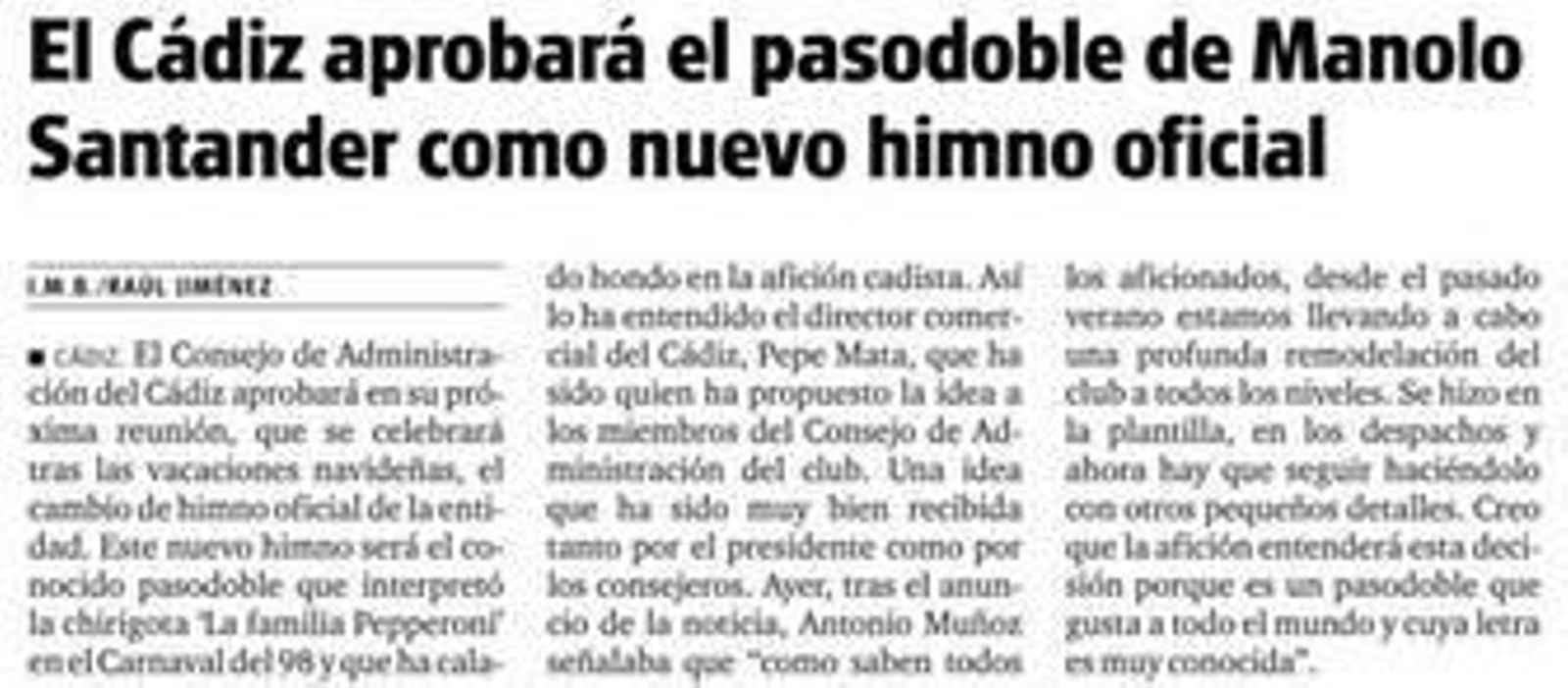 Gracias a estas inocentadas los lectores del Diario pudieron informarse, por ejemplo, de que Cádiz tendría una torre inclinada como la de Pisa gracias al silo de la antigua fábrica de cerveza que quedó en pie en 1991 tras la explosión de ese edificio; que todos los coches que quisieran entrar en Cádiz en el Carnaval de 1994 deberían pagar un peaje de 200 pesetas por ocupante; que para la final del Falla del año 2000 no se pondrían entradas a la venta porque todo el aforo sería para potocolo; que Teófila Martínez se había teñido el pelo de negro en 1999 para identificarse más con la mujer andaluza; que Pierce Brosnan (James Bond) sería el pregonero del Carnaval de 2002 en detrimento de Sara Baras, proclamada unas semanas antes y que no disimulaba su indignación por este cambio; o que la junta directiva del Cádiz CF cambiaría a principios de 2003 el himno oficial del club en beneficio del pasodoble de la chirigota La familia Pepperoni, de Manolo Santander.