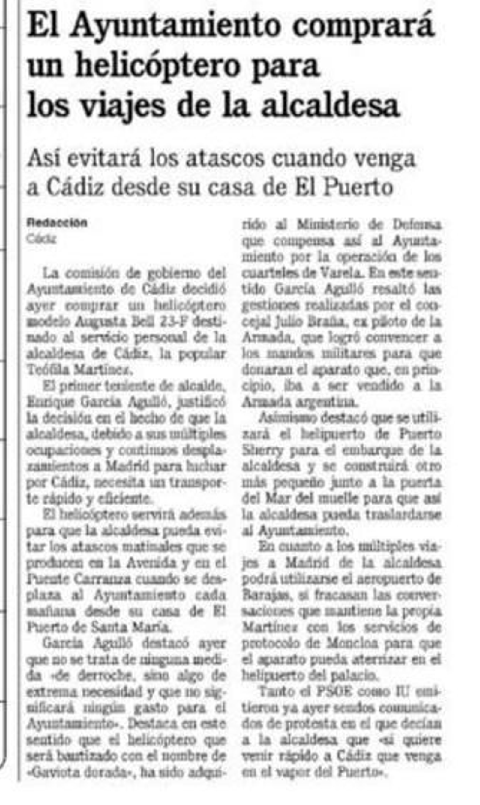 También ha habido inocentadas que provocaron una cascada de cartas al director en disconformidad con lo informado un 28 de diciembre. Así, por ejemplo, en 1996 muchos gaditanos mostraban su indignación por la noticia (falsa, por supuesto) de que el Ayuntaiento iba a comprar un helicóptero -modelo Augusta Bell 23-F, para más señas- para que Teófila pudiera evitar los atascos en la Avenida tanto en sus desplazamientos al Congreso como de su casa de El Puerto a la Acaldía.