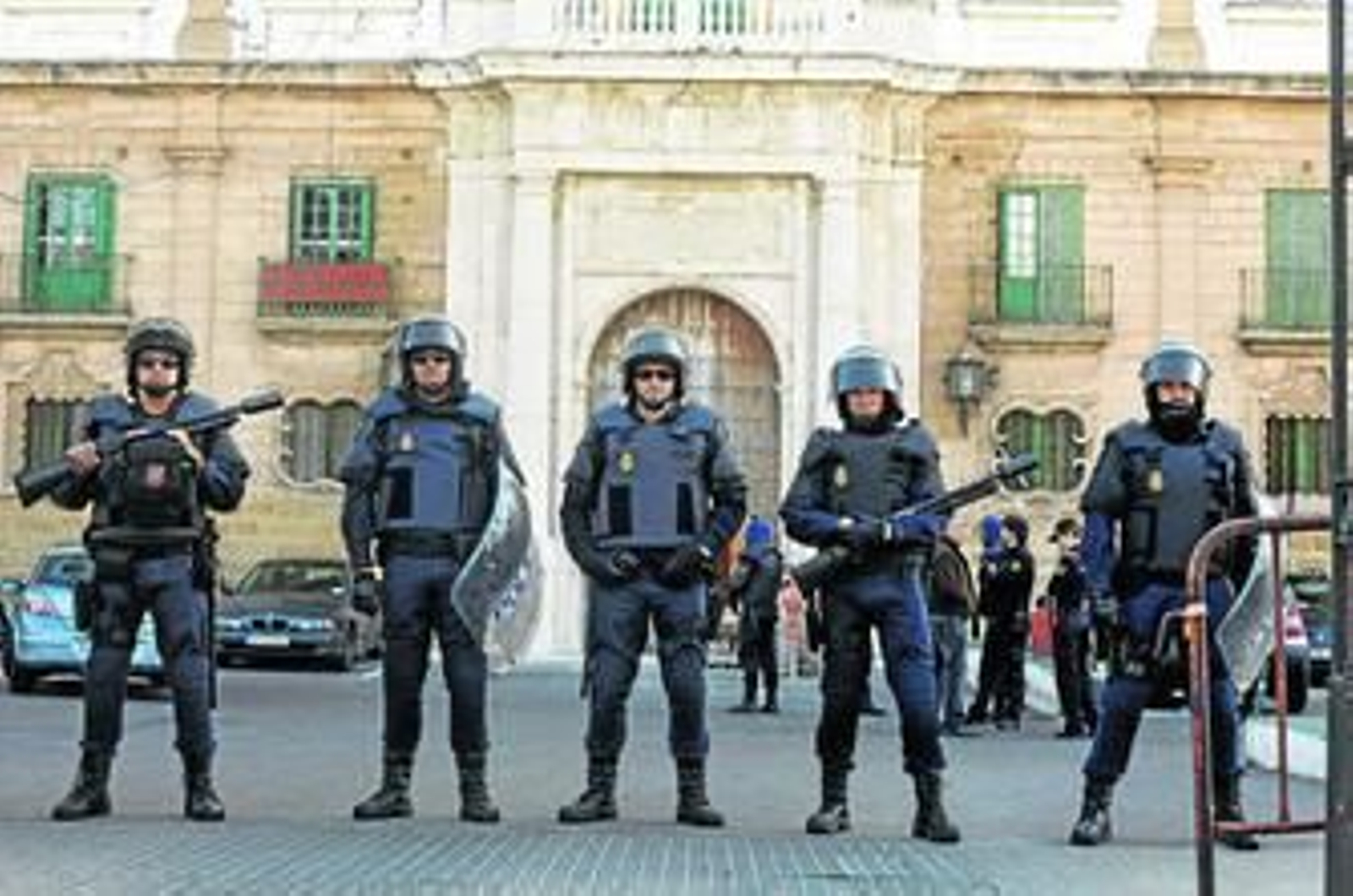 Los agentes de la Policía Nacional ponen una barrera para que nadie pudiera acceder al interior del Valcárcel.