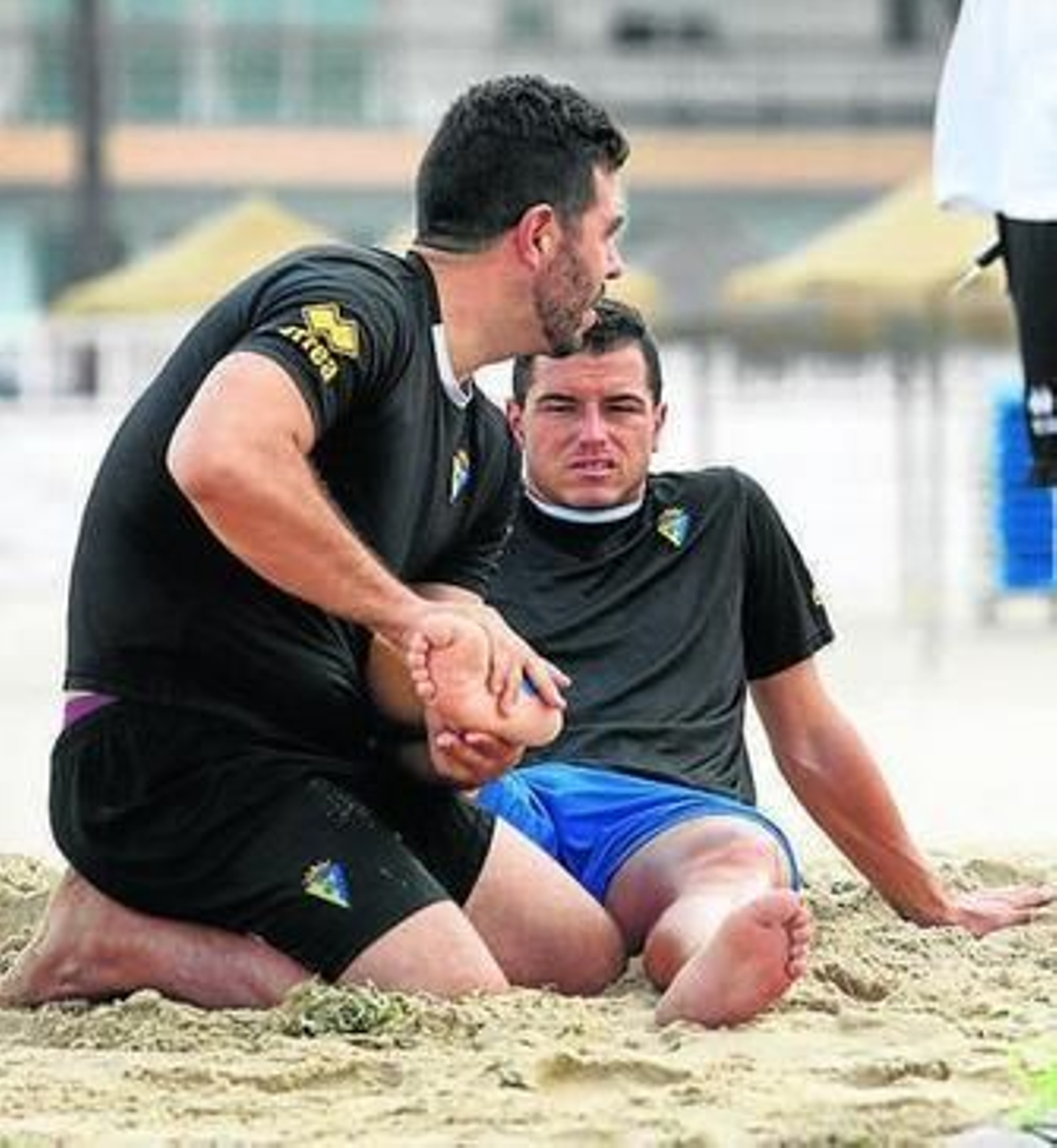 Convertidos en centro de atención de los bañistas y paseantes más madrugadores, Antonio Calderón, sus pupilos y los restantes técnicos empezaron sobre las 10 de la mañana con su tarea sobre la arena, consistiendo esta en carreras y ejercicios de diverso tipo que mantuvieron entretenidos a los futbolistas antes de darse el consabido y merecido chapuzón que puso la guinda. Lo de correr no fue moco de pavo pues llegaron más allá de Cortadura y volvieron hasta el hotel Playa.