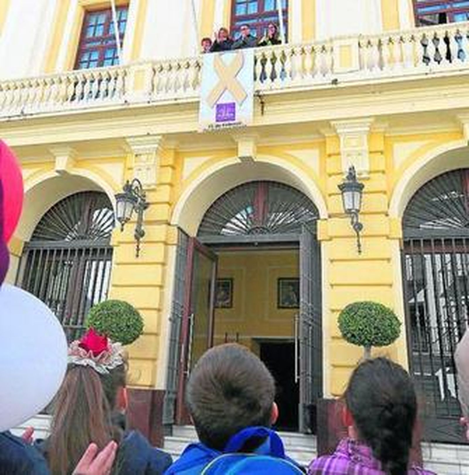 Hay que destacar que, coincidiendo con el paso de la marcha por la calle Constitución, los organizadores de la iniciativa y los delegados municipales de Familia e Infancia y Salud, Francisco José Salado y Mª Ángeles Martínez respectivamente, han desplegado una pancarta con un lazo amarillo en el balcón del Ayuntamiento.