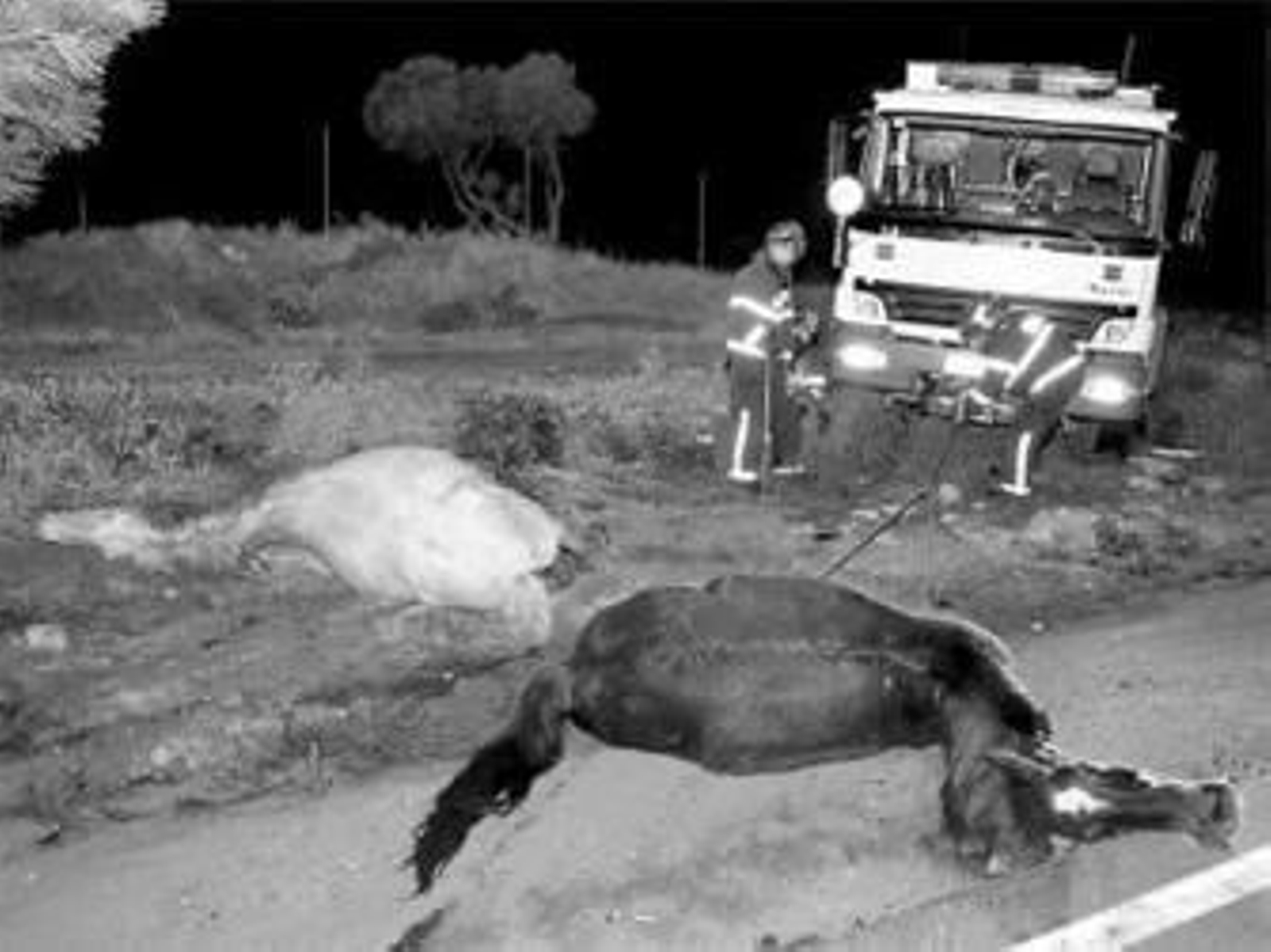 Dos caballos muertos y una persona herida es el resultado del accidente que se produjo en los primeros minutos de la pasada madrugada en la carretera de Carabineros, concretamente a unos 500 metros de la venta López. A esa hora, instantes después de las doce de la noche, una llamada alertaba de un espectacular accidente en esta vía. Pocos podían imaginar entonces el panorama que se iban a encontrar posteriormente los efectivos policiales, sanitarios y los miembros del Cuerpo de Bomberos que tuvieron que trasladarse hasta el lugar del suceso.