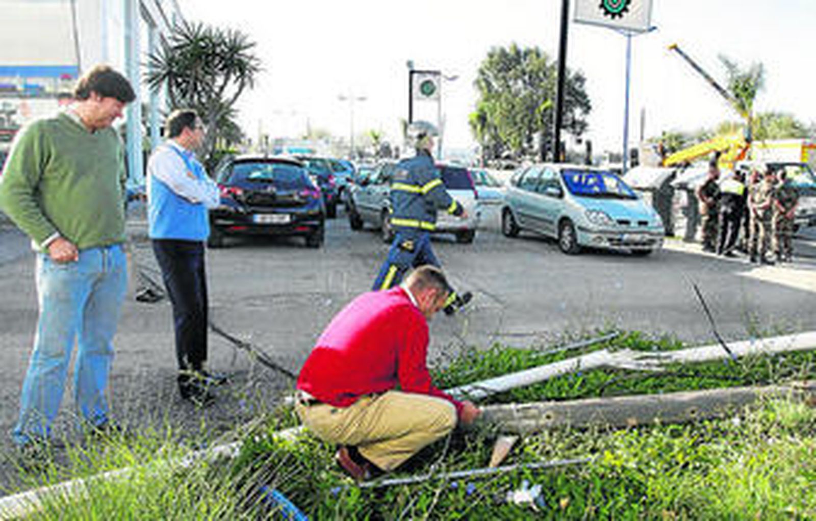 El incidente tuvo lugar sobre las diez de la mañana en el tramo comprendido entre las rotondas de la Venta Agustín y de entrada al centro comercial Eroski, concretamente a la altura en la que se encuentra el comercio 'El Danubio', cuando uno de los dos vehículos militares que circulaba en sentido Chiclana enganchó un cable de teléfono que cruza la carretera y que, a su vez, provocó la caída de una de las farolas que se encuentran en la mediana.