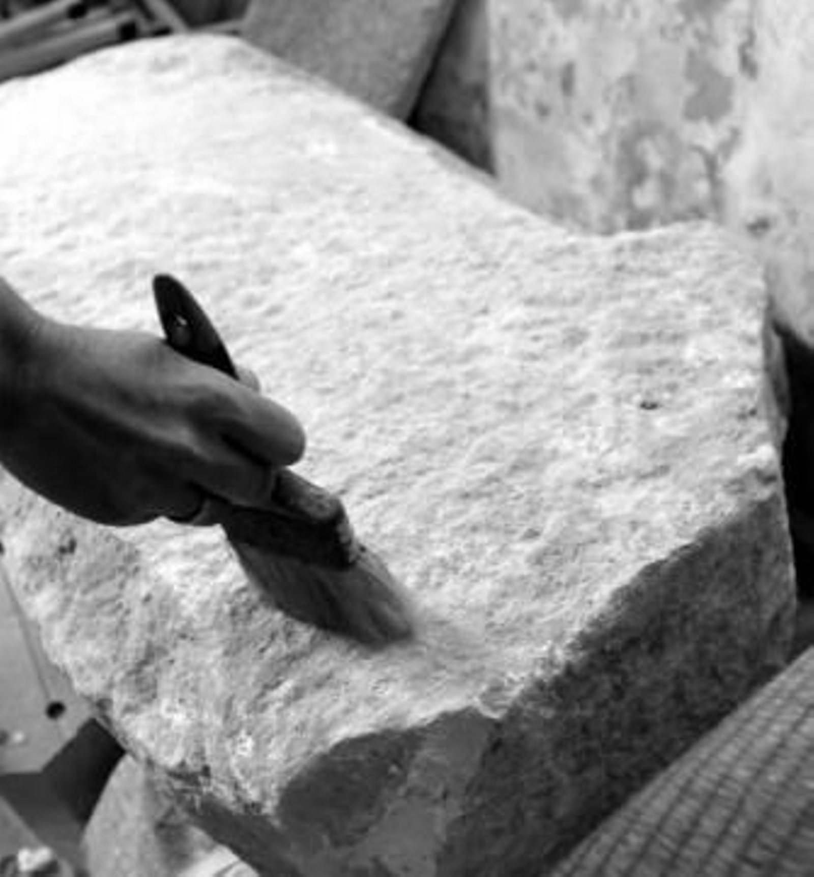 Uno de los arqueólogos examina un betilo o especie de monolito labrado.