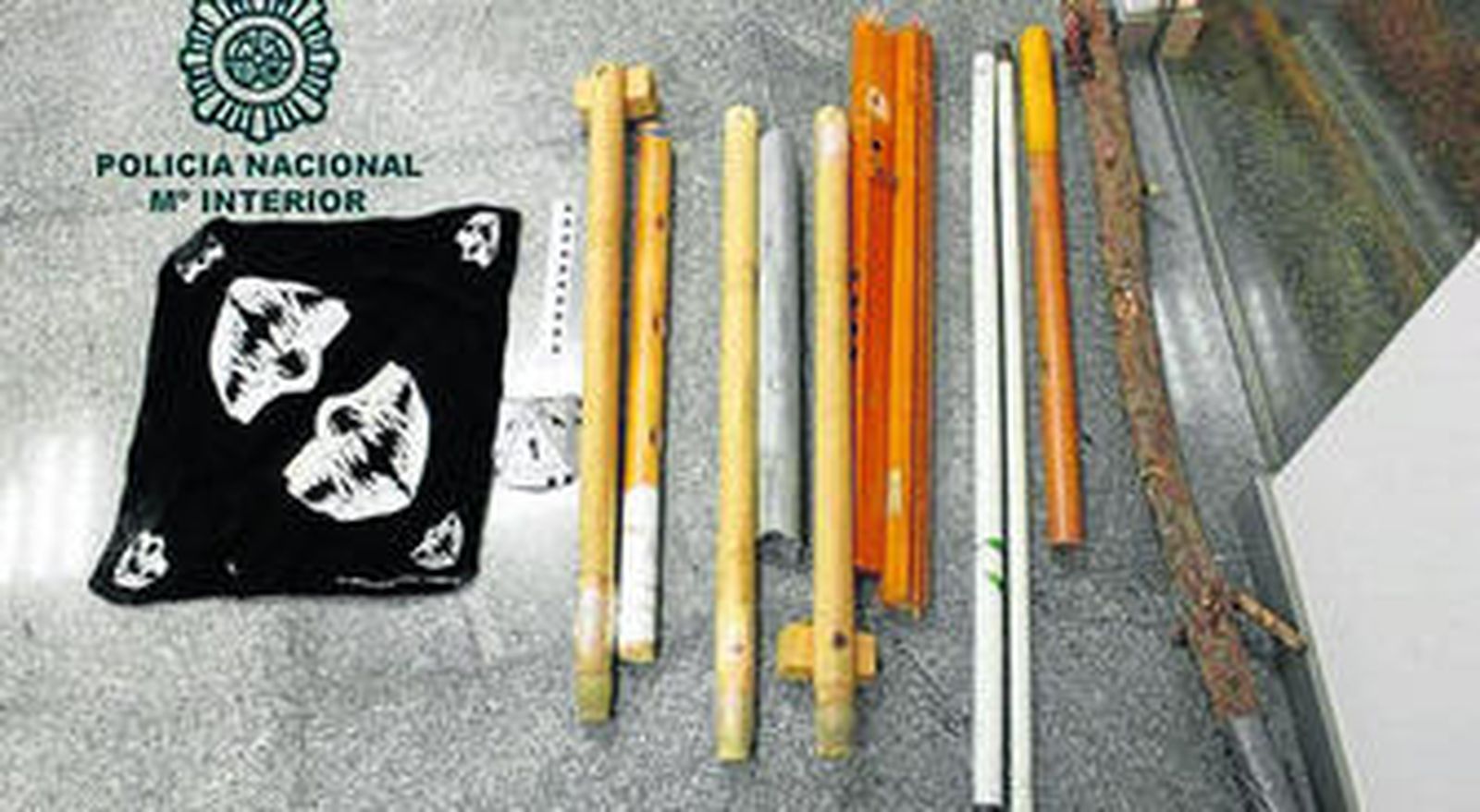 La Policía explicó que en la pelea, los agentes intervinieron hasta 19 instrumentos utilizados para agredirse, entre éstos, aparecieron estacas, palos, tuberías, varas metálicas, etc., además de pañuelos, caretas y sudaderas con las que los jóvenes ocultaban su identidad.