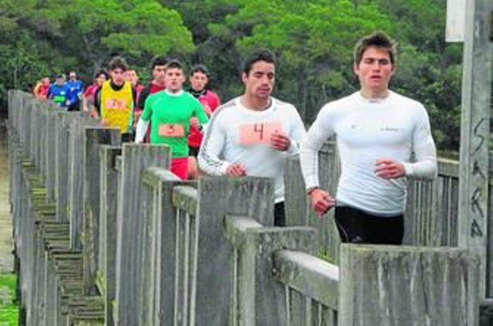 Un grupo de participantes, durante un tramo de carrera a pie por el puente de madera de Los Toruños.