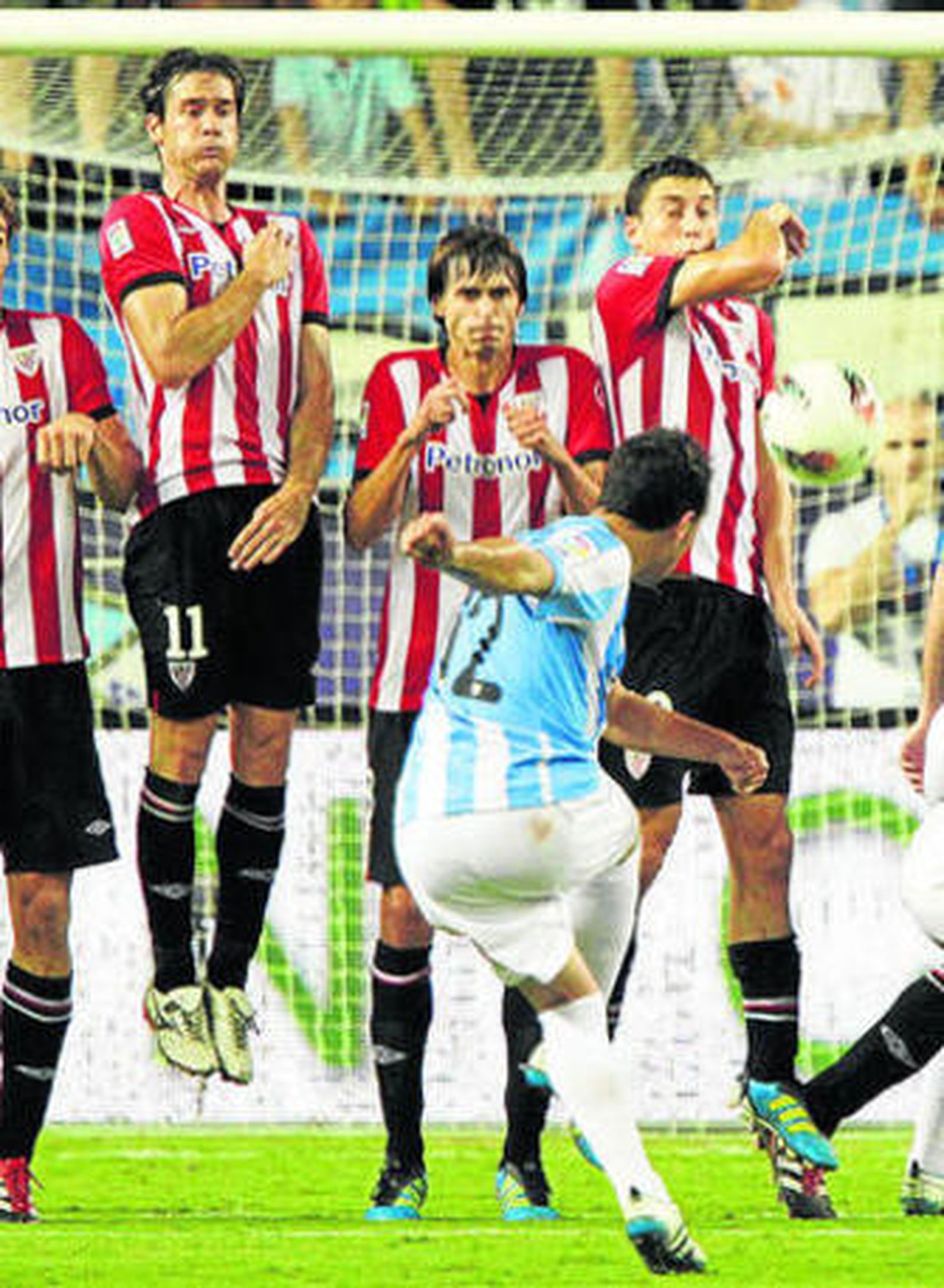MÁLAGA: Caballero, Gámez, Mathijsen, Demichelis, Eliseu, Joaquín (Sebastián Fernández, 87'), Toulalan, Duda (Maresca, 79'), Cazorla, Baptista y Van Nistelrooy (Rondón, 63'). ATHLETIC: Iraizoz, Gurpegui, Javi Martínez, Ekiza, Iraola, Iturraspe (David López, 65'), De Marcos, Muniain, Gabilondo, Llorente y Susaeta (Igor Martínez, 57') (Toquero, 71'). Árbitro: Teixeira Vitienes (cántabro). Amonestó a Cazorla, Iturraspe, Toquero y Javi Martínez. Gol: 1-0 (61') Cazorla. Incidencias: Partido correspondiente a la quinta jornada de la Liga BBVA disputado en el estadio de La Rosaleda ante 30.000 espectadores. Terreno de juego en buenas condiciones.