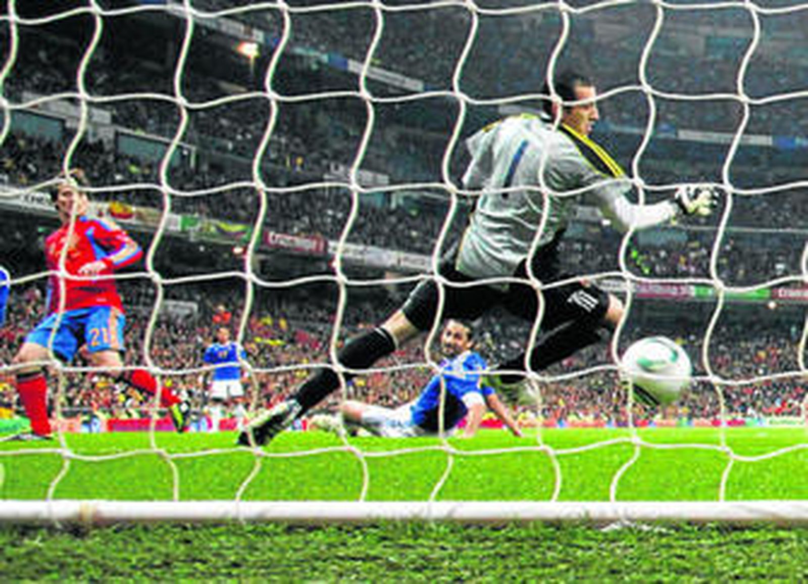 Toca con tanta calidad España que las ocasiones surgen. Disparos de Xabi Alonso lejanos que no encontraron camino libre al gol, una para Pedro o la más clara de Villa, cuando a los 15 minutos tras un pase de genio entre líneas de Iniesta, se plantó solo ante Ospina y se topó con el palo en el disparo. El rechazo con todo a su favor, a portería vacía, lo lanzó fuera. Aplazaba el momento de convertirse en el máximo goleador de la historia de la selección. No era el día de superar a Raúl en su templo.